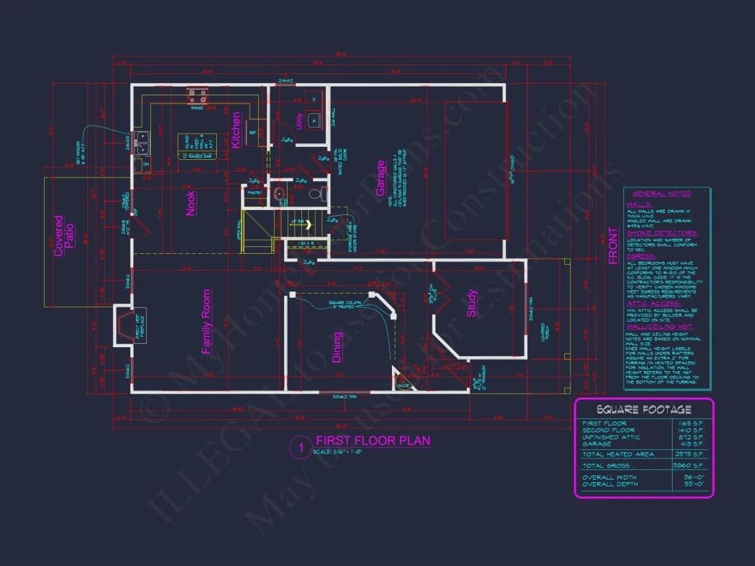 Width: 36′-0″Depth: 53′-0″Htd SF: 2,575Unhtd SF: 1,285Charming 2-Story Colonial Farmhouse Plan with Office & MudroomDiscover this beautifully detailed Colonial Farmhouse plan with 2,575 heated sq. ft., a front-entry garage, CAD blueprints, and flexible living spaces for families.This Colonial Farmhouse house plan offers a perfect mix of charm, comfort, and smart space planning. Designed with growing families in mind, it blends traditional character with modern functionality.Key Features of the Home PlanLiving Areas - Heated & UnheatedHeated area: 2,575 sq. ft. across two levels.Unheated extras: 1,285 sq. ft. including garage, attic storage, and covered porches.Bedrooms & Bathrooms4 bedrooms located on the second floor, including a spacious Owner Suite with a walk-in closet and private bath.2 full bathrooms upstairs, including a Jack and Jill bath between secondary bedrooms for easy access.Interior HighlightsOpen floor plan enhances flow between the kitchen, dining area, and family room. Explore open layouts.Fireplace in the family room creates a cozy gathering space. See fireplace house plans.Dedicated office/study on the first floor—perfect for remote work.Mudroom off the garage entrance for everyday organization.Garage & Storage DetailsGarage Bays: 2-car garage with front entry access.Garage Type: Attached with convenient entry into the mudroom.Storage: Includes attic space, coat closet near foyer, and pantry storage in the kitchen.Outdoor Living FeaturesInviting covered front porch enhances curb appeal and provides a welcoming entry.Rear covered porch and patio—perfect for outdoor dining or relaxation.Durable board and batten siding with shake details reflect Colonial charm.Architectural Style: Colonial FarmhouseThis design merges Colonial symmetry with Farmhouse functionality, creating a home that feels both classic and current. Learn more about the Colonial Farmhouse