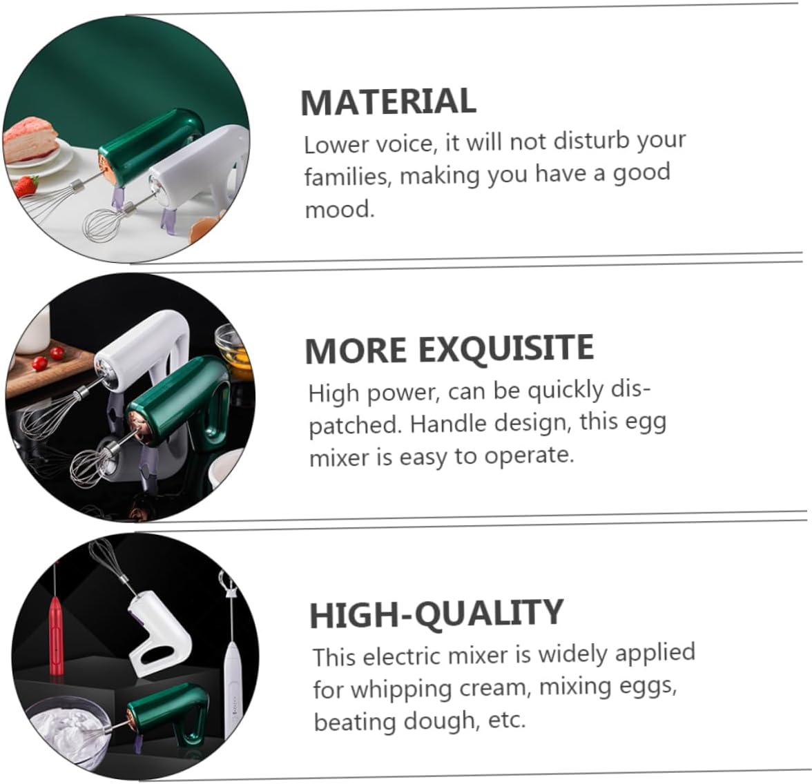 Package Include 1 x stirrer Characteristics -Battery capacity: 1500mAh Electric Egg. -Size: About 30.00X13.00X6.50cm/11.79X5.11X2.55inch Milk. -Material: Plastic, stainless steel Electric Mixer. -Rated power: 20W Milk Frother. -It is mixing seasonings, marinades, eggs, butter, pancake powder, etc Eggs Tool. - workmanship and materials a and details Handheld Mixer. -It is the right-hand assistant of chefs and bakers, improves baking efficiency and saves time waiting for delicious food Portable Egg Whisk. -Speeds of operating can be switched freely, egg liquid, complementary food, butter, flour, everything is easy to get, convenient and fast Kitchen Utensil. -Fine workmanship, no burrs, will not hurt your hands, and to use Kitchen Gadget.Goods InformationElectric Mixer This electric egg is made of stainless steel and plastic materials, which is and rust-proof to use in kitchen.Kitchen Utensil It is a assistant for whisking eggs, icing sugar mixture and melted chocolate fresh cream enable your baking more easier and