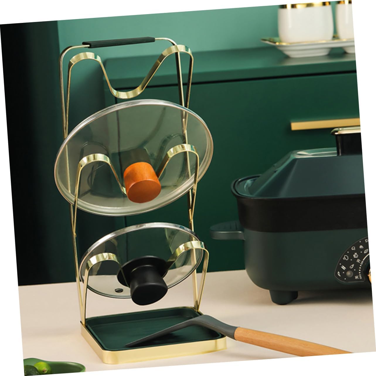 Package Include 1 x Storage Rack Characteristics - Color: Golden Kitchen Storage Holder. - Size: About 34.80X18.80X14.00cm/13.68X7.39X5.50inch Pot Cover Storage Shelf. - Material: PP, silicone, Lid Holder. - Large capacity, three layers design, easy to store your pot lids and tray can hold other items Organizer for Kitchen. - This is a suitable present for relatives, friends, and colleagues in housewarming Pot Lid Organizer. - This storage stand is easy and convenient to use without damaging wall Pot Lid Storage Holder. - Made of premium PP, silicone and iron material, which is sturdy and durable for use. Pot Cover Storage Rack - Simple and creative, it can match well with your home kitchen decoration style Pot Cover Storage Stand.Goods DescriptionPot Cover Organizer The reasonable design allows US to store kitchen supplies such as pot lids, chopsticks, spoons and so on.Home Storage Rack This storage rack has been treated with and can be used safely.Pot Lid Shelf This is a kitchen storage rack, which is made of materials and has a