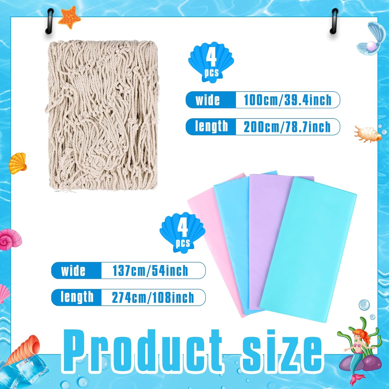 • Eye Catching Party Additions: the set of fishnet and tablecloth and plastic table cover is an eye catching party additions, good for nautical themed party, baby shower, birthday party, mermaid themed parties, mermaid party, luau party, nautical themed wedding and more.