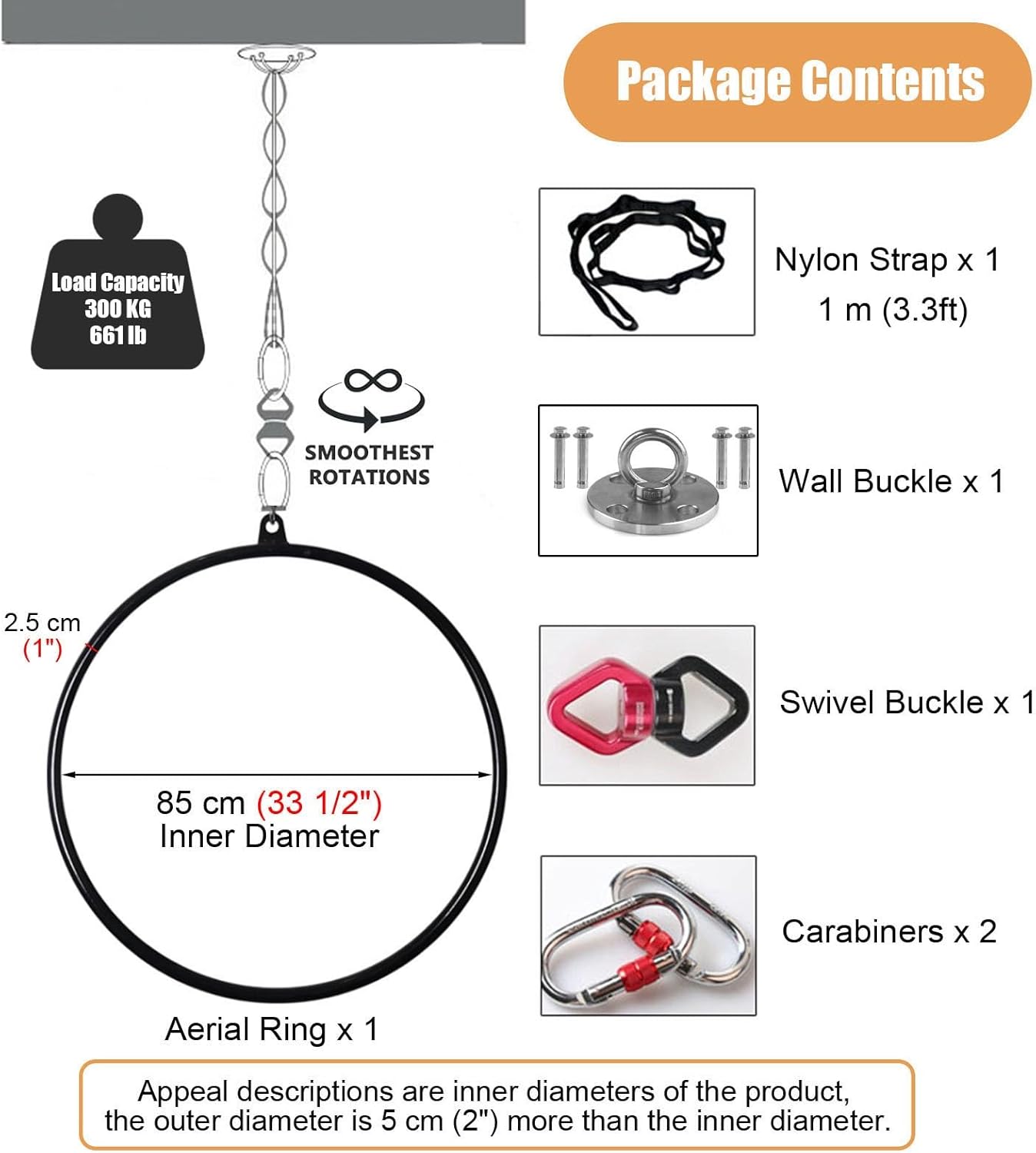 Yoga Hoop Gymnastics Acrobatic:Aerial hoops deliver an excellent full-body workout. They are an effective way to train your upper body strength, improve your flexibility, and build confidence. Get fit while having fun! Specification - Material: Iron - Product Thickness: 2.5 cm (1") - Product Inner Diameter: 80 cm (31"), 85 cm (33"), 90 cm (35"), 95 cm (37"), 100 cm (39") - Whether to Assemble: Yes - Maximum Load: 300 kg (661 lbs) - Color: Black Feature - Made of high load-bearing stainless steel. - Smooth surface to prevent scratching people. - Light weight, can move effortlessly with performers. - Helps to thin arm, waist, leg and lift hips and so forth. - For indoor, outdoor, home, gyms, dancing studio and performing place. Package Contents - 1 x Aerial Hoop - 1 x Swivel Buckle - 1 x Wall Buckle - 2 x Carabiners - 1 x Nylon Strap Warm Tips - The aerial arts are dangerous, please check your gear before each use. - In order to ensure safety, the joints of our rings have been reinforced by secondary welding, So the joints look a little blemished. - Due to different display and different light, there may be some color difference between the picture and the product. - Due to manual measurement, there is a 1-2 cm error, specific to the actual size shall prevail. After-sales Service - If you have any questions about monitor stand, please do not hesitate to contact us, we provide 24-hour customer service.