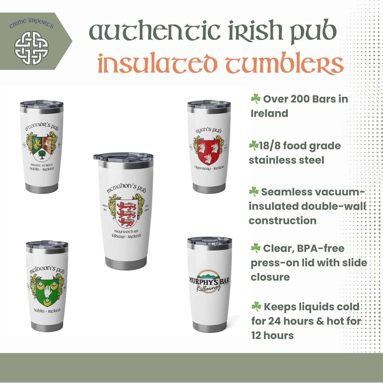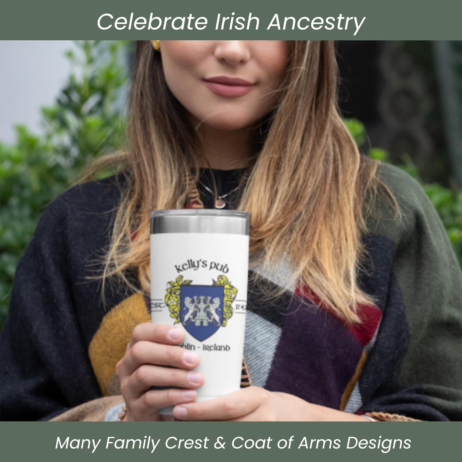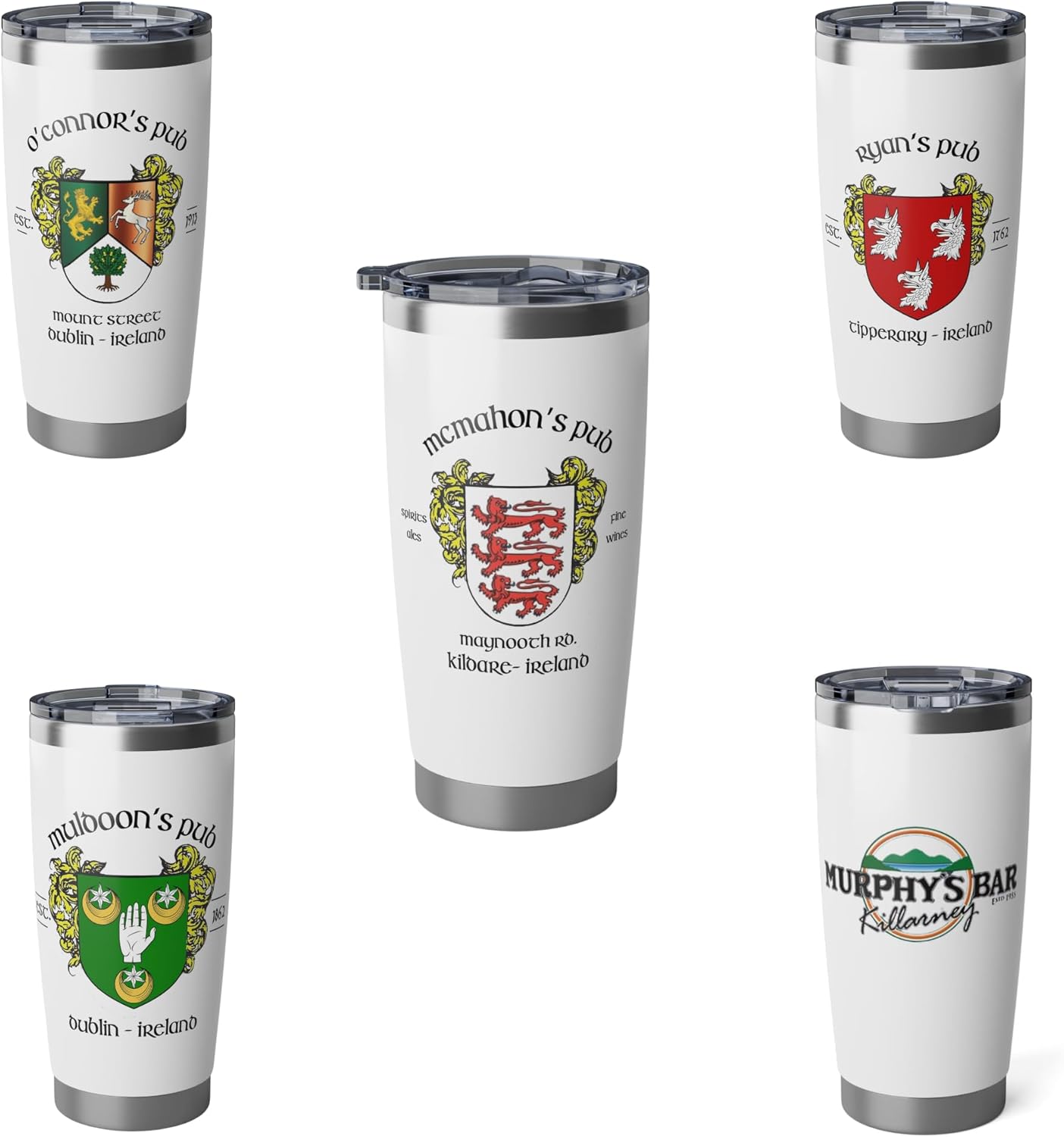 Experience the true essence of Ireland with our authentic 20 oz insulated tumblers with lids, inspired by over 200 Irish pubs and Irish bars and featuring family crest and coat of arms designs. These tumblers capture the unique spirit of Ireland’s most cherished gathering places, offering a piece of authentic Irish pub culture that you can take with you wherever you go. Each tumbler represents one of Ireland's iconic Irish pubs, featuring designs, logos, and artwork that tell the story of the pub it comes from. Many designs even feature the Irish family crest or Irish coat of arms, celebrating Ireland's rich heritage. Whether it's a historic Irish pub in a quaint village or a lively Irish bar in the heart of Dublin, these tumblers bring a touch of Irish pub tradition into your daily routine. With over 200 unique designs, no two tumblers are alike, making this collection a must-have for any lover of Irish pubs and culture. Crafted for durability and convenience, these 20 oz tumblers are designed to keep your beverages at the perfect temperature—whether hot or cold. The double-wall insulation ensures your drink stays just the way you like it, while the included lid helps prevent spills, making it perfect for on-the-go use. Whether you're enjoying your morning coffee, afternoon tea, or evening cocktail, these tumblers offer a stylish and practical way to savor your favorite drinks. These tumblers are not only functional but also a unique way to connect with the warmth and camaraderie of Irish pubs and Irish bars. Perfect for collectors, Irish pub enthusiasts, or anyone seeking a distinctive, practical item, they make an excellent gift for any occasion. With our Irish pub insulated tumblers, you're not just getting a drink container—you're holding a piece of Ireland's rich pub heritage. Take the charm of an Irish pub or Irish bar with you wherever you go, and enjoy your drinks with a touch of Irish authenticity.