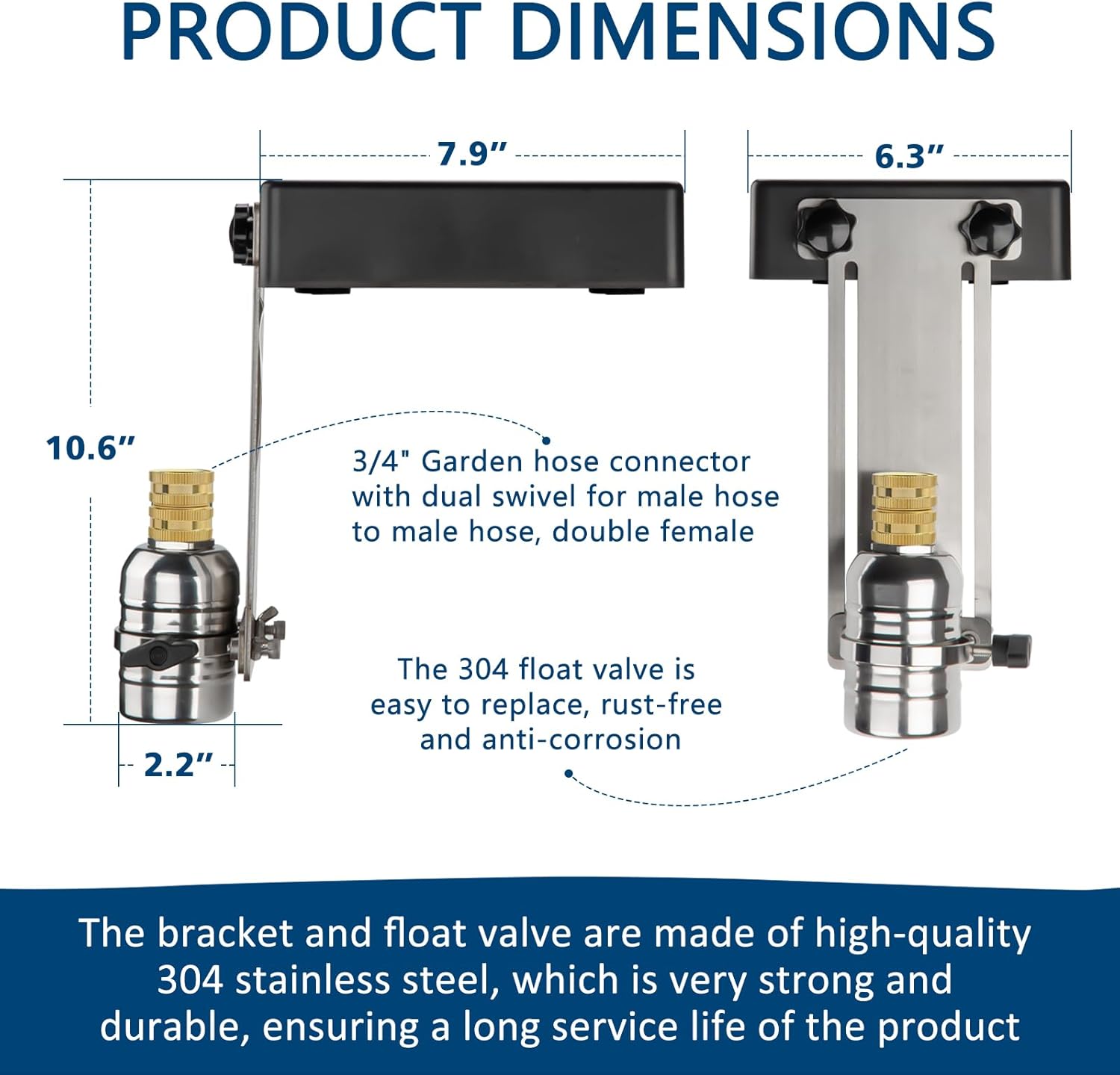 Automatic pool filler, a water level height controller with ultra-high sensitivity. This summer, you can easily have a refreshing swimming pool, without the hassle of manually filling the pool, and away from the worry of constantly monitoring the water level and commuting to the hot and humid outdoors When you have this brand new water level control artifact, you don't have to worry about the water level dropping throughout the summer, keeping your pool at the height you set The upgraded swimming pool water leveler auto fill regulator has undergone repeated testing, and we have made new improvements in both the overall material and performance details of the product. The float valve and bracket are made of 304 stainless steel, while the base stabilizer is made of UV resistant ABS material. The float valve water inlet has added a detachable threaded adapter, allowing your garden hose with 3/4 inch male or female threaded interfaces to be compatible. The water level height can be adjusted within a range of 2 inches to 9 inches. The counterweight box only needs to be filled with small stones to work stably, eliminating the phenomenon of water leakage in the old counterweight box Attention: If your water pressure is above 60psi, you will need a separate pressure regulator Working principle of stainless steel float ball valve: By utilizing the buoyancy of the float ball in water, as the water level rises and falls, the float ball drives the valve stem, thereby controlling the opening and closing of the valve and achieving automatic control of the inlet water