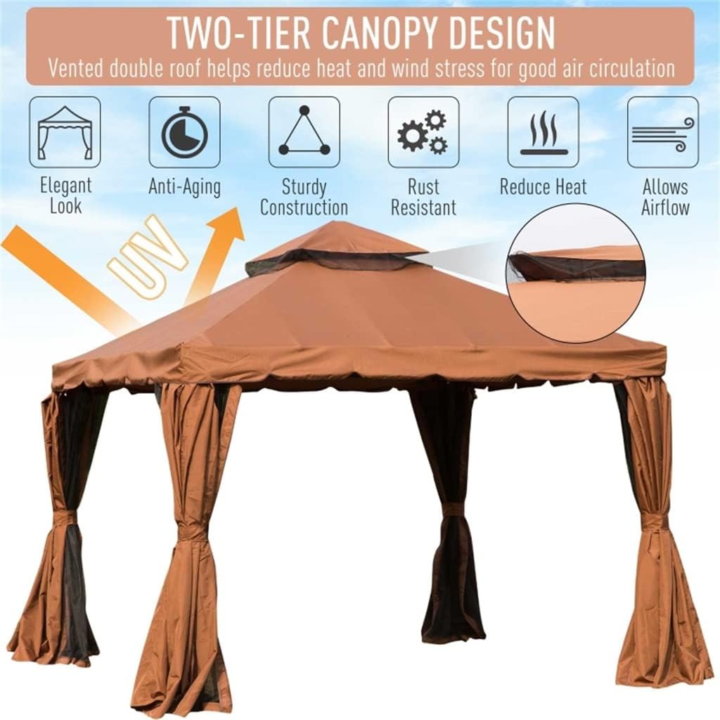 - Practical Soft Top: Top cover is made of PA-coated polyester, provides protection against 99% sun's harmful UV rays to keep you in a comfortable shaded area on hot sunny days.- Polyester Curtains and Mesh Sidewalls: The outer curtains of this beautiful deck gazebo are made of coated polyester to help protect against the harmful effects of the sun, while the inner curtains are netted mesh fabric with 4 built-in zippers for protection against annoying elements.- Frame and Excellent Design: The powder-coated, rust-resistant aluminum and steel frame is rugged, sturdy- A two-tier canopy top provides proper ventilation and airflow for guests to enjoy underneath while the water-resistant top of the screened gazebo has 8 built-in grommet holes that provide essential drainage. With 8 ground stakes included helping secure your structure to the ground.- Spacious -Air Or Private Enclosure: With a 9-foot tall peak, 10-foot length, and 10-foot width our gazebos for patios is roomy enough for your entire party to gather under without feeling crowded. Remove the mesh netting to enjoy an -air feel or attach it to protect against annoying elements and use the curtains to create a private oasis.- Gazebo Info: Overall Dimensions: 116.5" L x 116.5" W x 76.75" / 104.25" H. Eave Height: 77.25" H.- Assembly requiredSpecification:- Color: Brown- Material: Steel, Mesh, Polyester Fabrics- Overall Dimensions: 116.5" L x 116.5" W x 76.75" / 104.25" H- Eave Height: 77.25" H- Eave Edge: 7.5" H- 8 ground stakes included- Top cloth: 180g / m²- Interior Fabric Wall: 140g / m² polyester enclosing cloth- Mesh Fabric Wall: 35g / m² black gauze nettingNote: Not to be left up during adverse weather conditions.1 x gazebo8 x ground stakes1 x manualNote:Due to