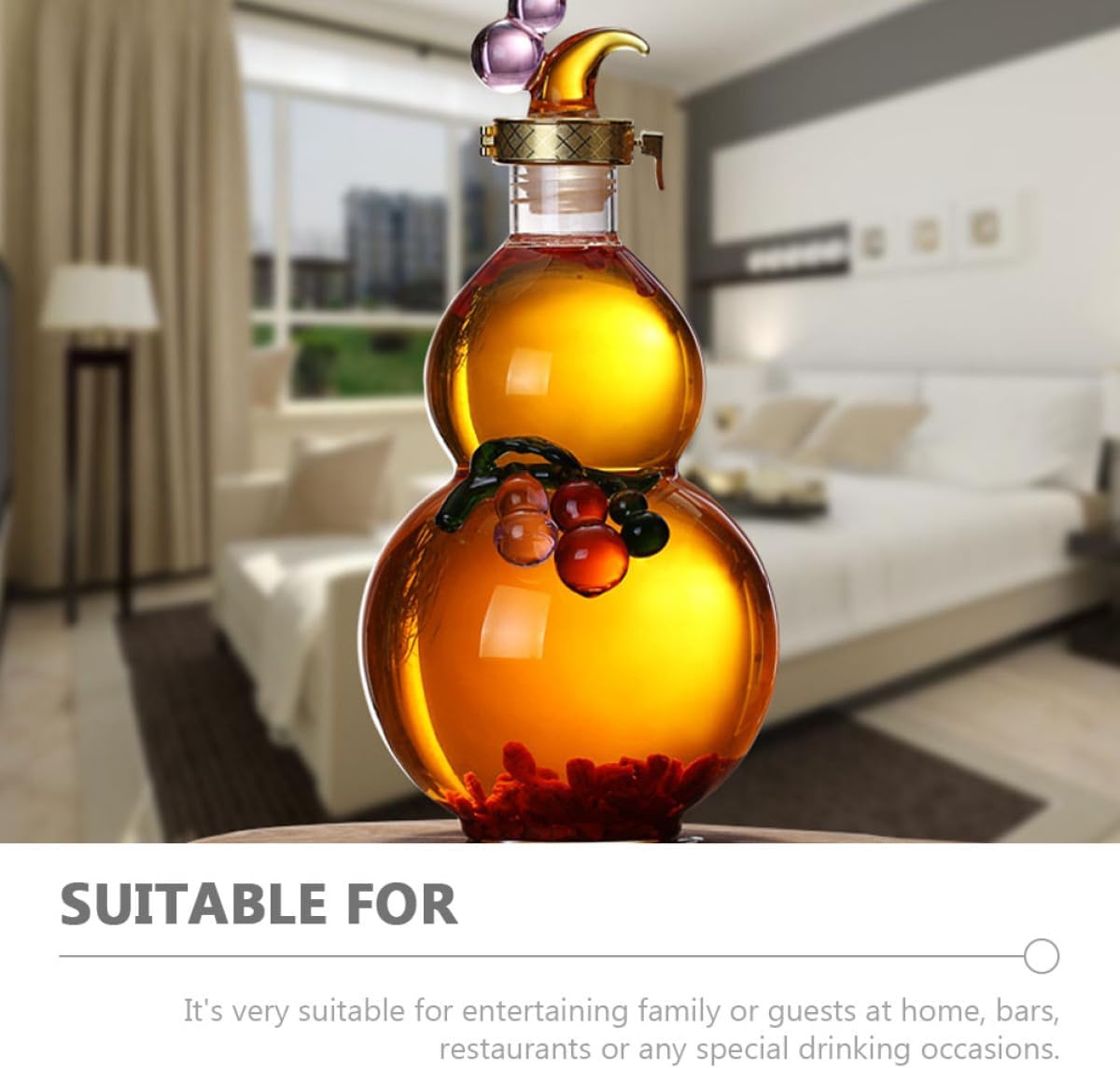 Package List 1 x glass bottle Characteristics -Color:Transparent -Material:Glass -Size:28.00X13.00X13.00cm/11.00X5.11X5.11in -Product Info:Wine-soaked glass bottle -It can also be used as for your family and friends. They must be happy to receive the empty glass bottles. -The wine glass container is very suitable for home decoration and can create a unique artistic atmosphere bottle gourd water bottle. -Suitable for storing and dispensing wine, whiskey, water, juice, beverage and other liquid gourd shaped bottle. -Made with workmanship, the rim is very smoothly polished. Won't hurt your hands when you are using it drinking gourd. -Made of premium and reliable glass material, and practical. It also can be used for a long time.Goods Descriptionbottle shaped gourds And made of glass material, and is safe to use.bottle gourds Very suitable for private gatherings of friends and family.gourd shaped flask The wine holder is made of good glass materials, can use it with confidence.drinking gourd It's suitable for drinking water, wine and spirits