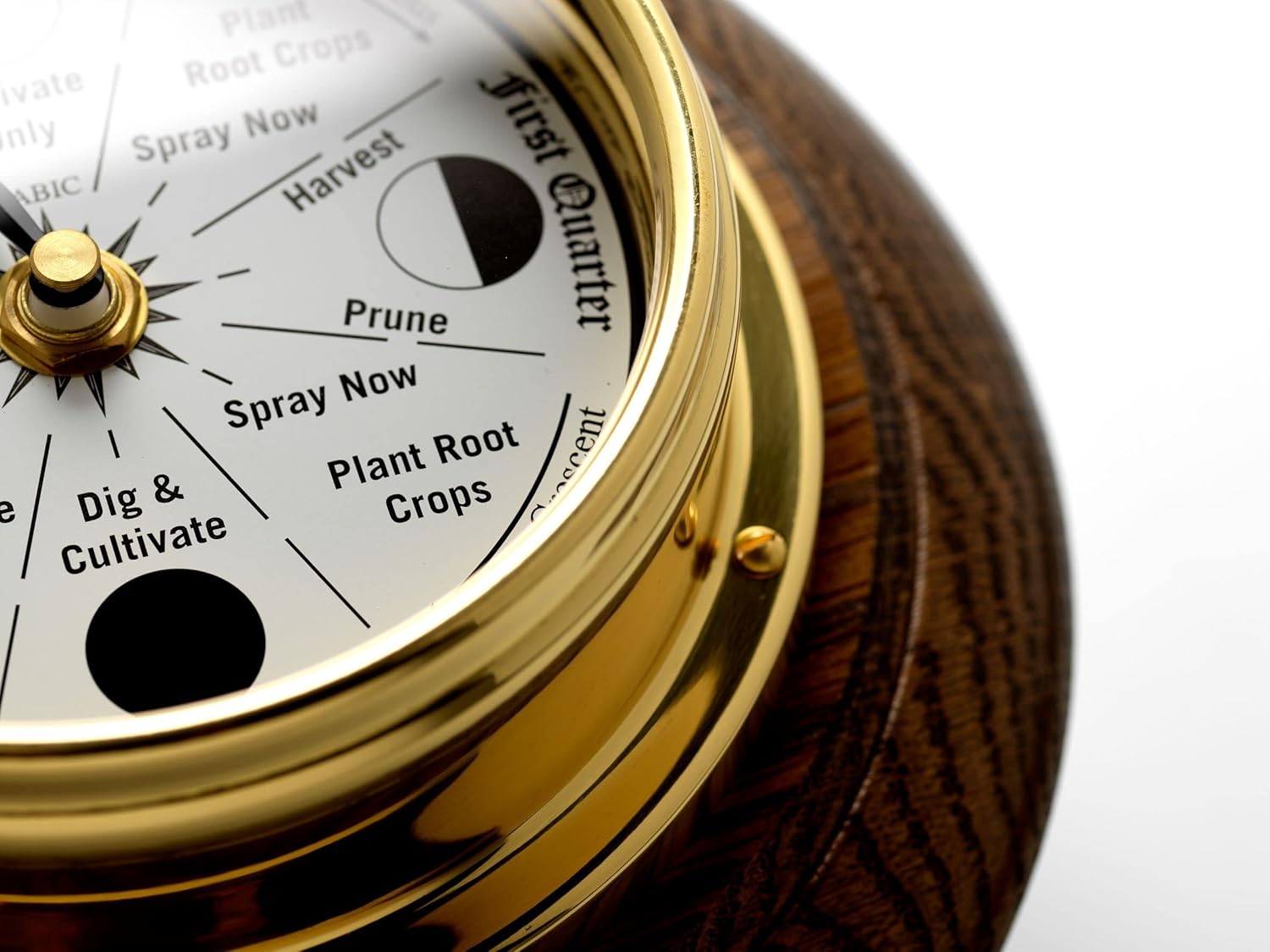 Solid Brass Moon Gardening clock Mounted on a Solid English Oak Wall Mount. Dark Stain Varnish Finish (beautifully made by local wood turner) Overall Dimensions - 205mm Diameter. 65mm Depth. and a 1.5mm thick brass case. THE QUALITY OF THESE CLOCKS ARE REFLECTED BY THEIR WEIGHT. (beware of light weight imitations)The gravitational pull of the moon influences the rise and fall of the tides, but it also affects soil moisture, plant sap and the water table. A moon gardening clock will quickly and easily show you the most beneficial times to plant and harvest your crops. For most of human history, farmers have looked to the night sky, to the phases of the moon, to know when to plant their fields, Gardeners who rely on planting by the moon’s phases are convinced that this ancient tradition produces healthier, more vigorous plants and bigger crops.