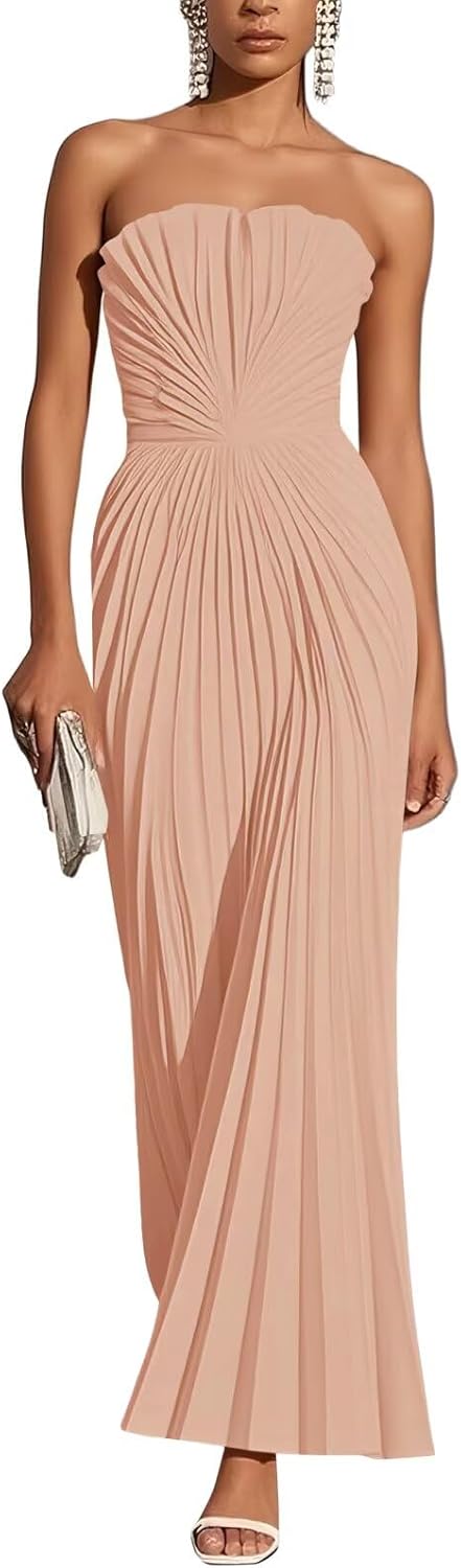 | Embellishment Feature | Elegant Wedding Guest Dress, Satin Pleated Long Dress, Satin Prom Dress, Satin Wedding Guest Dress, Strapless Formal Dress |