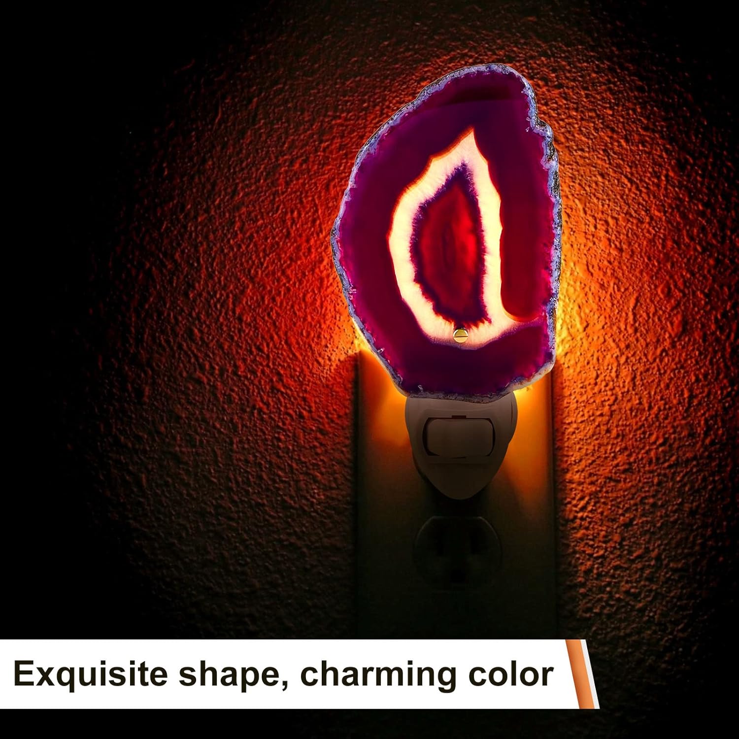 Features: Easy to match: The crystal night lights are designed with delicate shapes and bright colors, which can match well with your other home decorations and furniture, saving you time and energy. Impress your gift recipient: The wall plug light can be applied as a thoughtful gift for your loved ones on housewarming day, and they will be happy and surprised to receive this gift. Specifications: Main material: natural agateMain color: purple and blueSize: about 3.94 x 3.15 x 2.36 inches/ 10 x 8 x 6 cmPackage includes: 2 x Night wall lightsNotes: Manual measurement, please allow slight errors on size. The color may exist a slight difference due to different screen displays. Suitable for people over 12 years old. Adults' supervision is required.