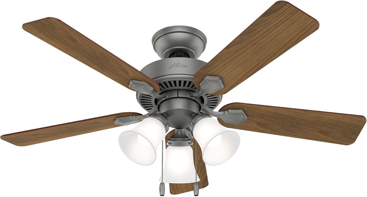 Hunter Swanson transitional ceiling fan with lights is a part of the professional series that is available in a variety of sizes, finishes, and light kit combinations. Add this Hunter ceiling fan to every room in your home with confidence, knowing it's wobble-free, whisper-quiet, and long-lasting. The LED light ceiling fan is designed as a ceiling fan light fixture with fully-dimmable, high-efficient LED bulbs that give you total control over your lighting. This adjustable mount fan comes features a three-position mounting system to allow for standard, low, or angled mounting. With a 13-degree blade pitch optimized to ensure air movement and peak performance, this living room ceiling fan with lights and reversible fan comes with reverse rotation fan blades, allowing it to keep the rooms in your home cool during summers and warm during winters. Ideal for use in rooms or spaces with ceilings 9' or greater, this product is a great choice when choosing a bedroom ceiling fan with lights or a kitchen ceiling fan.