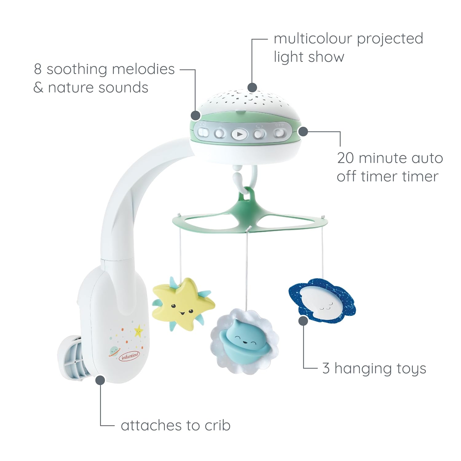 Your little dreamer will fall deeply with the Infantinos 3-in-1 mobile music projector. This multifunctional and calming phone can be used in 3 ways from small to toddler as a musical mobile (0-5 months), a crib night light and a star projector (6-18 months), as well as a table lamp and a star projector (18 months). The projector illuminates the room with a starry sky and plays soothing melodies, making it easy for your child to take a nap. The music phone also has 3 hanging toys and an automatic switch-off setting in 20 minutes, so you and your child can relax. The smart sound sensor means that the music will be played when baby crys. Brighten your bedtime routine with the mobile 3-in-1 music projector from Infantino!.
