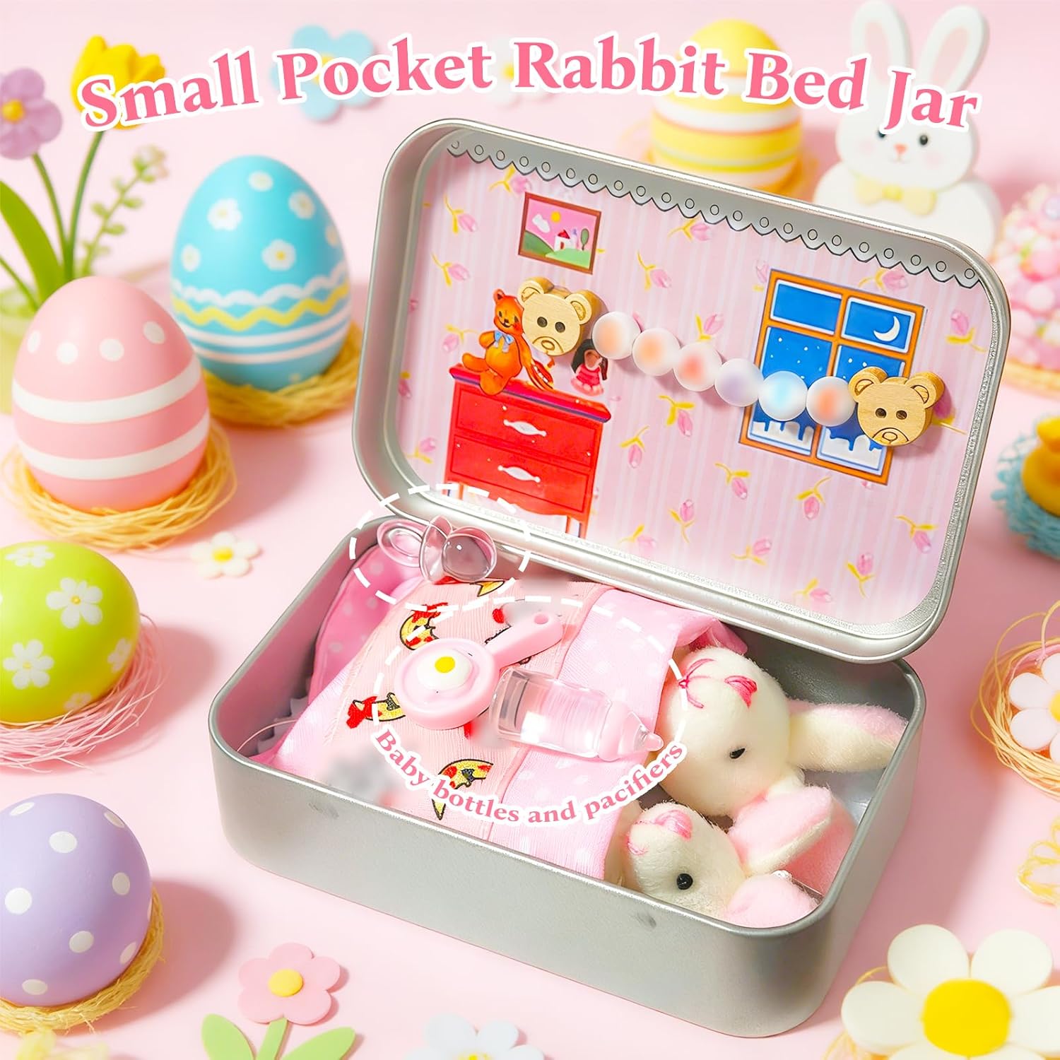 Product description Dive into Easter Joy with Our Plush Bunny Pocket Toy Set! Make this Easter extra special with our charming Easter Plush Bunny Pocket Toy Set—packed in a sturdy tin box for safekeeping and gifting. Measuring 9.5*6*2cm, this compact set is designed for little hands and big imaginations, offering endless hours of fun both at home and on the go.