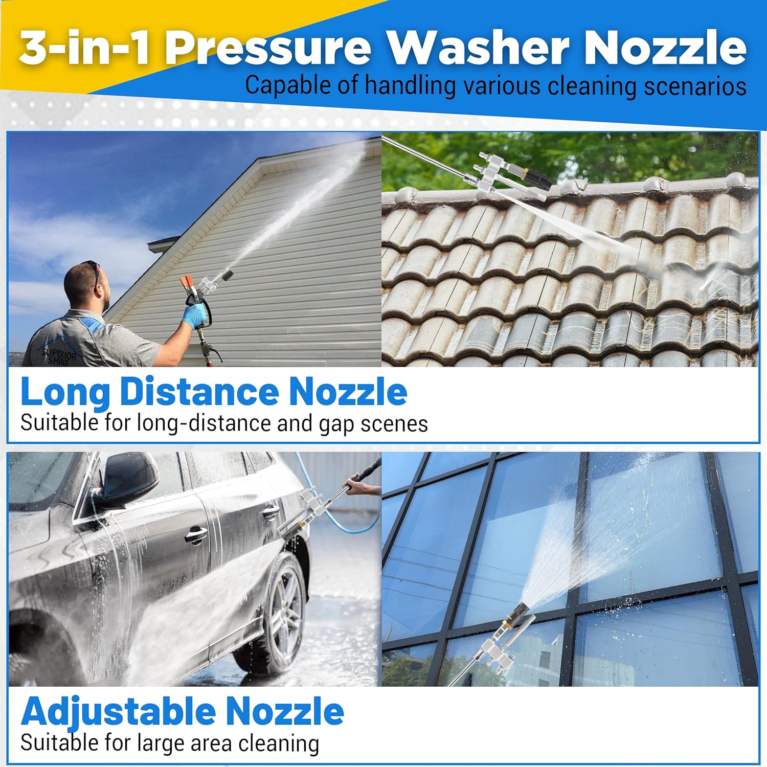 3-in-1 Multi-Function Nozzle: This versatile M5 twist nozzle integrates three essential cleaning modes into one tool: a long-range chemical shooter for high areas, a downstream soft wash nozzle for applying cleaners, and a standard pressure washer tip for general cleaning, offering seamless switching between tasks. Durable Construction: Constructed from premium stainless steel and reinforced brass, this downstream soft wash nozzle is engineered to resist corrosion from chemicals and endure pressures from 1000 to 6000 PSI, delivering lasting reliability in demanding cleaning environments. 30 Feet Long-Distance Spray: The integrated long range shooter tip propels water and solution up to 30 feet, turning your pressure washer into an extended-reach tool for cleaning roofs, second-story surfaces, fences, and trees—safely from the ground. Universal Compatibility: With a standard 1/4" quick-connect fitting, this high pressure washer nozzle works seamlessly with most pressure washers (3.5-6 GPM). Ideal for both residential and commercial use, from delicate siding washes to heavy-duty concrete cleaning. Easy Handling: The long distance spray nozzle features a polished stainless steel body that resists chemical damage while the quick-connect system allows instant attachment changes. Operates efficiently across the full 1000-6000 PSI range for adaptable cleaning power.
