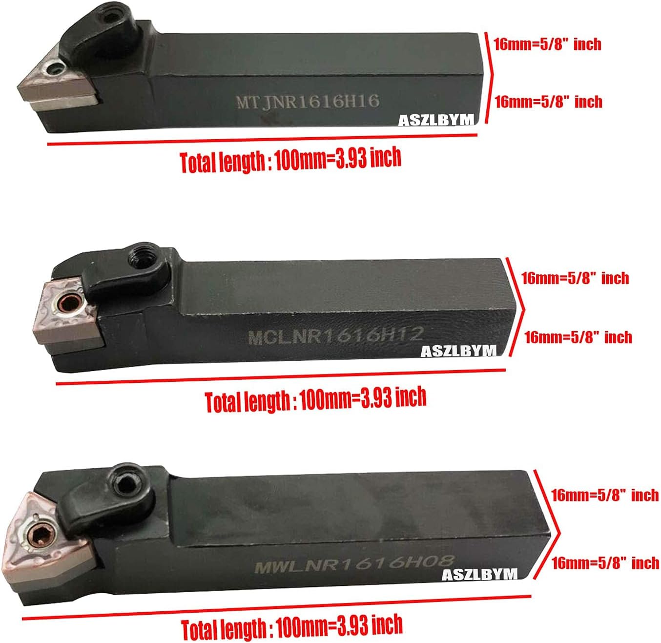 Package:1PC MTJNL1616H16 1PC MWLNL1616H081PC MCLNL1616H121PC TNMG3311PC WNMG4311PC CNMG4311PC MTJNR1616H16 1PC MWLNR1616H081PC MCLNR1616H121PC TNMG3321PC WNMG4321PC CNMG43230PCS CNMG 432/WNMG 432/TNMG 332---------MTJNL1616H16Shank Diameter length×width: 16*16 mmOverall length:100 mm≈3.93 inchMain declination: 93ºShim:ST 1603Pin: MCT513Clamp:HL 1814Screw:MCS625Wrench : L2.0 ,L3.0Inserts : TNMG 160404 / TNMG 331--------MWLNL1616H08Shank Diameter length×width: 16*16 mmOverall length:100 mm≈3.93 inchMain declination : 95ºShim : SW 0804Pin : MCT617Clamp : HL1814Screw : MCS625Wrench : L2.5 , L3.0Inserts : WNMG 080404 / WNMG 431--------MCLNR1616H12Shank Diameter length×width: 16*16 mmOverall length:100 mm≈3.93 inchMain declination : 95°Shim:SC 1204Pin : MCT617Clamp:HL1814Screw:MCS625Wrench : L2.5 , L3.0Inserts :CNMG 120404 /CNMG 431---------MTJNR1616H16Shank Diameter length×width: 16*16 mmOverall length:100 mm≈3.93 inchMain declination: 93ºShim:ST 1603Pin: MCT513Clamp:HL 1814Screw:MCS625Wrench : L2.0 ,L3.0Inserts : TNMG 160408 / TNMG 332--------MWLNR1616H08Shank Diameter length×width: 16*16 mmOverall length:100 mm≈3.93 inchMain declination : 95ºShim : SW 0804Pin : MCT617Clamp : HL1814Screw : MCS625Wrench : L2.5 , L3.0Inserts : WNMG 080408 / WNMG 432--------MCLNR1616H12Shank Diameter length×width: 16*16 mmOverall length:100 mm≈3.93 inchMain declination : 95°Shim:SC 1204Pin : MCT617Clamp:HL1814Screw:MCS625Wrench : L2.5 , L3.0Inserts :CNMG 120408 /CNMG 432