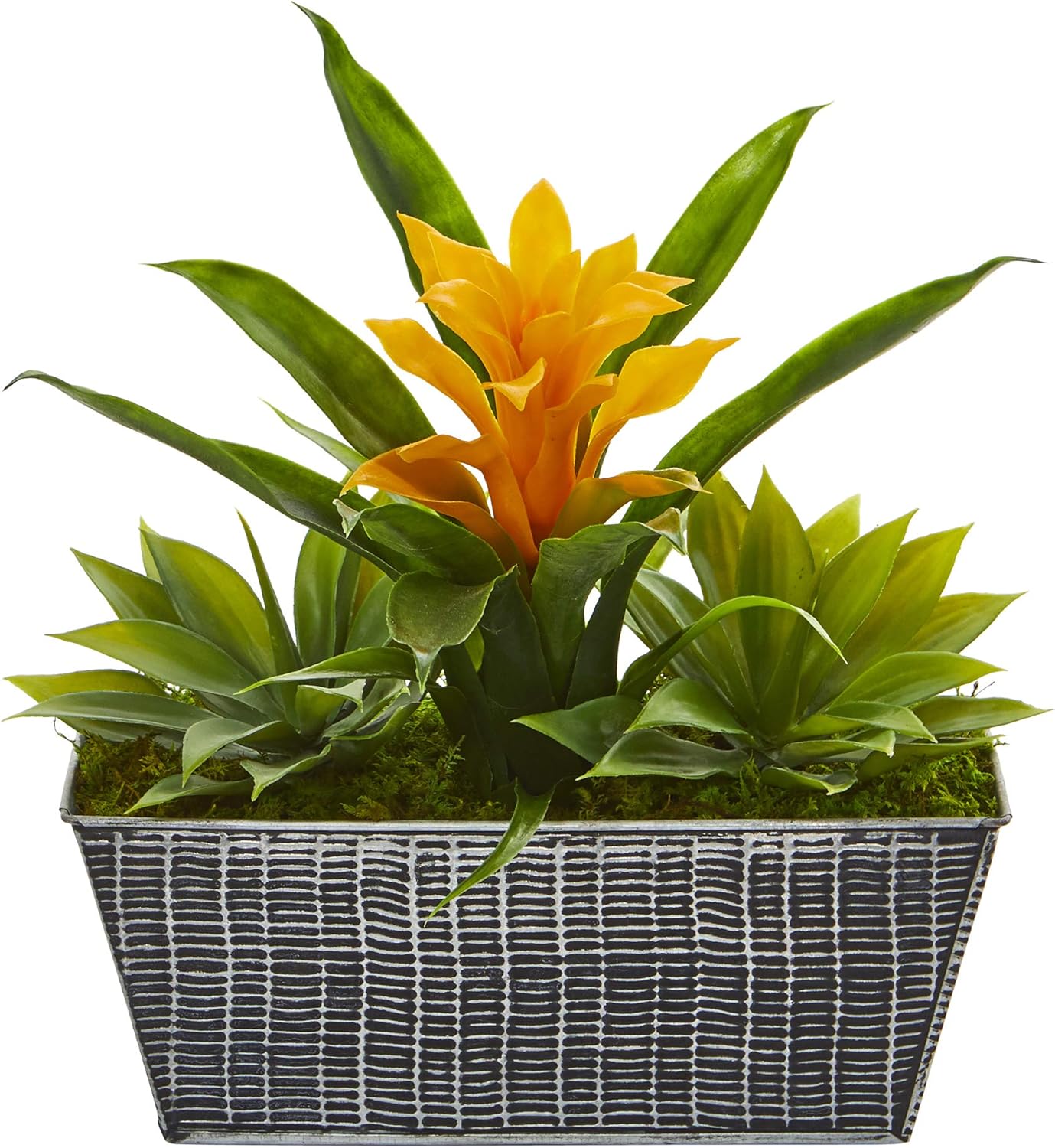 Create a colourful focal point with this artificial bromeliad and Agave plant. Boasting naturally occurring details, this tropical silk plant features a single bromeliad flower, handsomely complemented with a single Agave at the base. Standing 11in. High from an embossed Twin planter, This Silk plant would easily brighten a reception desk or office. About Nearly Natural - for over 75 years, Nearly Natural Has been providing conscientious consumers with beautiful alternatives to natural decorations. Employing and advised by naturalists who understand the live plant world, Nearly Natural is able to recreate the most realistic-looking decorative items for homes, offices, and businesses. Driven by a true commitment to customer service, attention to detail, and natural philosophy, Nearly Natural strives to bring customers The most beautiful, unique, and striking faux plants and floral on the market. Silk arrangements are manufactured using synthetic materials, such as polyester material or plastic, and are well designed and constructed to be life-like in appearance. This item may need to be re-shaped when removed from the secure box to allow it to reach its fullest size. Your plant will look beautiful for years to come; simply wipe clean with a soft dry cloth when needed.