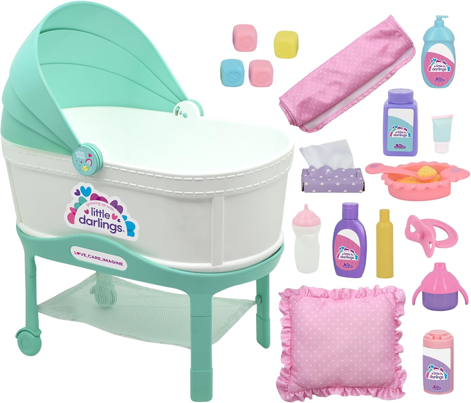 LITTLE DARLINGS: 12" BASSINET BABY DOLL SET - TEAL, PINK, STARS - Little Darlings 12" Bassinet Baby is a play set that everyone needs! This amazing set includes your very own plastic bassinet with moveable hood that can go up or down, wheels to roll your bassinet around if you want and a storage net on the bottom to store all of your many accessories that are also included ion this set. Our Bassinet baby is a 12" soft body doll with a removable onesie outfit and matching hat. Be sure you care for every need your baby has; whether feeding, sleeping or changing you will have it all right here. Accessories included are a baby bottle, sippy cup, feeding dish with spoon, tissue box with tissue, pacifier, 4 building blocks, lotion tube, 4 play bottles, wipes bottle blanket and pillow. Place your baby in her bassinet for a nap but be sure to tuck her in with her blanket and pillow. She will be so cozy. Perfect for ages 2 and up. SET INCLUDES: 1-baby doll, 1-bassinet, 1-outfit, 1-hat, 1-pillow, 1-blanket, 1-pacifier, 1-tissue box, 1-tissue, 1-feeding dish, 1-spoon, 4-blocks, 1-sippy cup, 1-baby bottle, 4-play bottles, 1-lotion tube, 1-wipes bottle, 1-base to bassinet, 1-storage net.