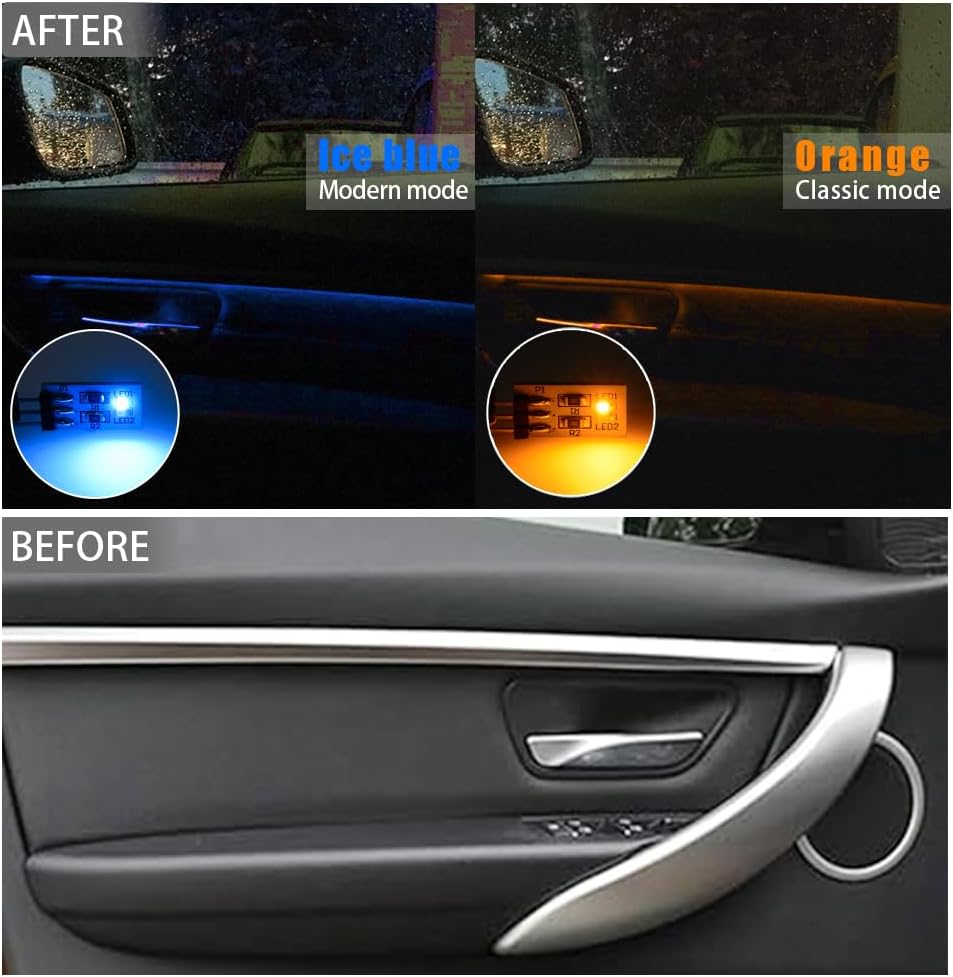 Orange-Blue LED Door Handle Circuit Board Ambient Lighting Kits Create Awesome Illumination and Unique Style for Your Ram Pickup Trucks! Specifications & Features 1. Type: LED Circuit Board Replacement for B-MW models 2. Color: Orange(Classic Mode)&Blue(Modern Mode) 3. Color Temperature: 6000-6500K 4. Lifespan:>50,000 hrs, service time longer than stock Interior Courtesy Lamp 5. Dimension: 1.06*0.39 inches (Length*Width) 6. Fitment on vehicle: Door Handle Ambient Lighting 7. High power double chips light board, high brightness low power consumption 8. Help you easily find what you're looking for at night 9. Easy installation, no modification, direct replacement and fitment Fitment: For Door Panel/Door Handle Ambient Lighting 2014-2020 B-MW M4 F82 (4X) 2014-2020 B-MW M4 F83 (4X) 2012-2019 B-MW 3 Series Sedan F30 (4X) 2010-2016 B-MW 5 Series Sedan F10 (4X) 2012-2019 B-MW 3 Series Touring F31 (4X) 2013-2019 B-MW 3 Series Gran Turismo F34 (4X) 2013-2020 B-MW 4 Series Coupe F32 (4X) 2014-2020 B-MW 4 Series Convertible F33 (4X) 2014-2020 B-MW 4 Series Gran Coupe F36 (4X) 2016-2022 B-MW X1 F48 (4X) OEM Part Number: 63319353133, 63319242150, 63319311188 Please confirm your vehicle with original dual-color ambient light before purchasing! Note: Only compatible with the vehicle with dual-color ambient lights. Please check the model year and trim level of your B-MW vehicle before purchasing! Suitable for cars only have handle trim lights. If your car has both the trim lights and storage lights, choose the 10pcs set. Package: 4 X LED Interior Door Panel Lighting Module Circuit Board Replacement for 3 Series sedan F30