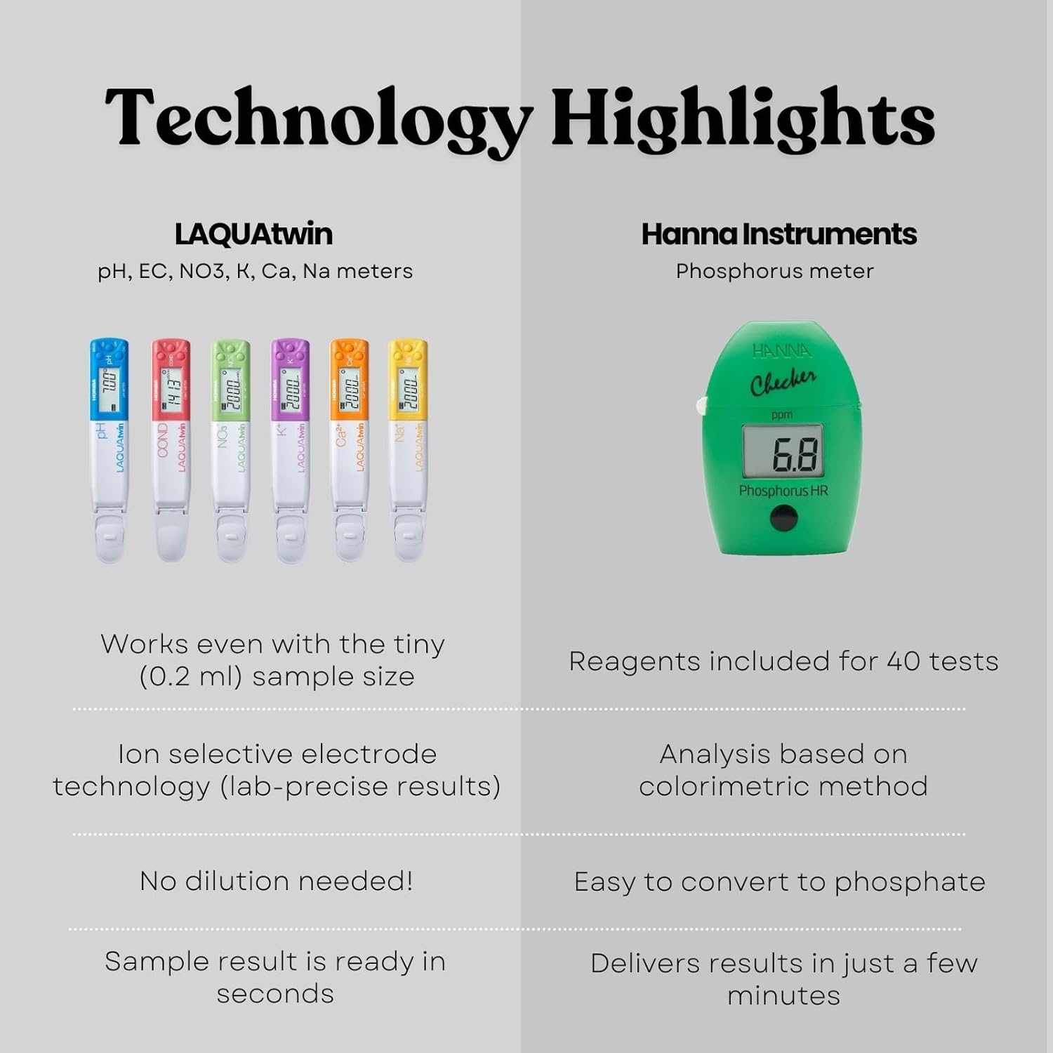 The Nutricheck LAQUAtwin kit is our core plant sap and soil testing equipment. This kit is an essential nutrient testing tool for anyone working in crop science and involved with plant nutrition management. Designed for professional growers and agronomists, it allows to perform lab-precise analysis in field conditions, so you can take the right decision for your crop right on the spot. More complete than other LAQUAtwin kits, it contains digital pocket meters from renowned brands, so you can literally bring your lab wherever your job takes you. This complete kit also includes essential sampling equipment (beakers, syringes, cleaning solution). Once opened, it converts itself into a testing platform for the convenience of your field operations. This kit also includes all the accessories and consumables for intensive use. The NutriCheck LAQUAtwin kit is a comprehensive nutrient testing tool that can measure 7 critical crop and soil parameters that include Nitrate, Phosphorus, Potassium (NPK meters), pH, EC, Calcium and Sodium. Stop sending your sample for regular lab analysis and go beyond basic reagent colorimetric test kits. Our Nutricheck LAQUAtwin kit allows simplified field operations and delivers quick and accurate analysis, supported by Ion Selective Electrode method (applicable for LAQUAtwin). With this sophisticated technology you can achieve immediate lab-precise results without expensive reagents. KIT INCLUDES: - pH meter (LAQUAtwin pH-11) with 2 x 60 ml calibration solutions (pH 4 & 7) - Conductivity meter (LAQUAtwin EC-11) with 2 x calibration solutions (1.41 & 12.88 mS/cm) - Nitrate meter (LAQUAtwin NO3-11) with 2 x calibration solutions (150 & 2000 ppm) - Potassium meter (LAQUAtwin K-11) with 2 x calibration solutions (150 & 2000 ppm) - Calcium meter (LAQUAtwin Ca-11) with 2 x calibration solutions (150 & 2000 ppm) - Sodium meter (LAQUAtwin Na-11) with 2 x calibration solutions (150 & 2000 ppm) - Phosphorus meter (Hanna HI706) with 40 reagents and 4 test tubes - 1 x carrying case with customized foam to fit 7 meters, solutions and test tubes - 2 x 25 ml glass beakers, 2 x 1 ml plastic syringes, 1 x 5ml glass syringe, sensor cleaning solution, water bottle, 1 x USB memory stick - Testing guide with application notes, sampling preparation guide and nutrient reference ranges