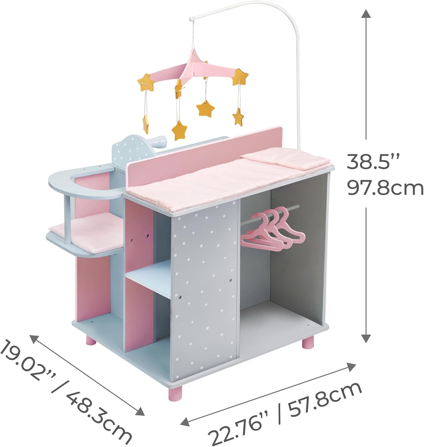 This spacious and realistic doll nursery features a crib, changing area, sink, high chair, washing machine, and cabinet. The double-door cabinet provides storage for baby doll clothes and accessories. The realistic mobile with a moon, stars, and clouds will keep baby doll entertained. This is a great option for bedrooms and playrooms where space is at a premium. Made of durable MDF construction with bright colors and realistic details will keep your child engaged while using their imagination. Olivia's Little World's high-quality children's wooden furniture and accessories have been expertly crafted and designed for longevity, exceeding all safety standards. We take pride in beautiful pieces that encourage your child's imagination while seamlessly fitting into your home