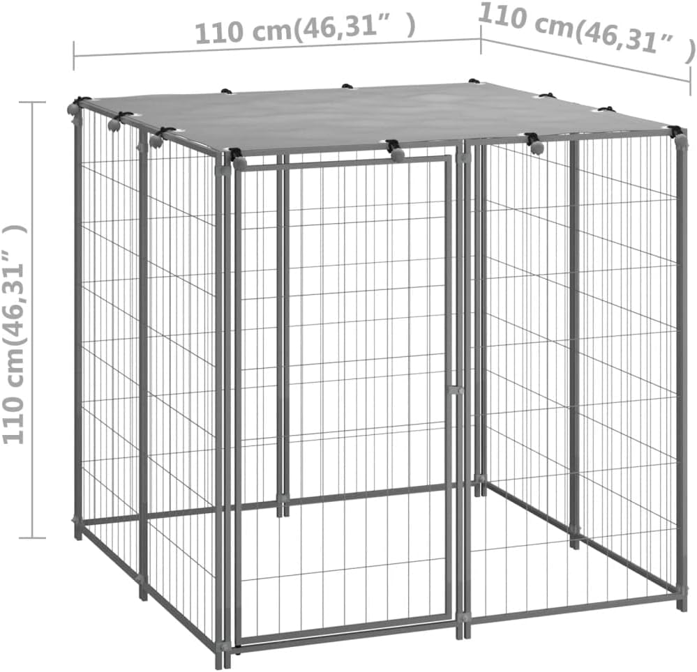 This versatile dog kennel has multiple uses: playing, exercising, training, or simply keeping your dogs safe. It will be the perfect play paradise for your furry friends!This large dog kennel provides ample exercise space. The chain link fence helps prevent mischief or unexpected accidents, while enabling ventilation. Thanks to the sturdy steel construction, this high-quality dog kennel is durable. The gate is equipped with a lock to keep your dogs extra safe. The dog kennel is easy to assemble.Color: SilverMaterial: Galvanised steelOverall dimensions: 18.7' x 18.7' x 6.1' (L x W x H)Inner dimensions: 224.4" x 224.4" x 72.8" (L x W x H)Gate with lockWith 4 anchorsHot-dip galvanised chain link fence
