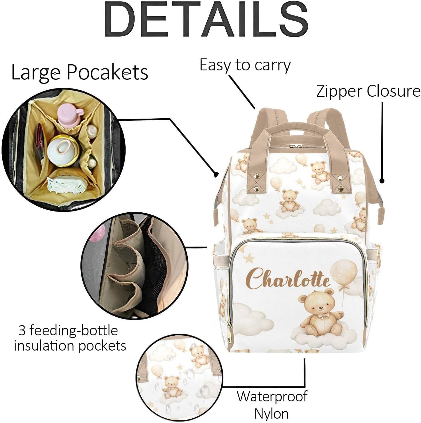 Personalized Diaper Bag Backpack – Custom Name Baby Nappy Bag for Moms & DadsPremium Waterproof Material – This custom diaper backpack is made from high-quality waterproof nylon, durable and easy to clean. The stylish unisex design makes it a great choice for both moms and dads, perfect for everyday use or travel.Spacious & Organized Storage – Measuring 10.83"(L) x 6.69"(W) x 15"(H) with a 3.1" hand drop, this personalized diaper bag backpack offers a large main compartment, multiple inner pockets, and 2 side storage areas. Easily carry diapers, wipes, clothes, bottles, toys, snacks, and books without feeling cluttered.Multi-Pocket Functional Design – The front compartment features 3 insulated bottle pockets to keep milk or drinks at the perfect temperature, plus a mesh pocket for small essentials. Extra side pockets are ideal for wipes or water bottles, while inner compartments with 4 slip pockets and 1 zippered pocket provide maximum organization for baby and parent essentials.Comfortable & Versatile to Carry – Designed with padded back support and adjustable shoulder straps, this custom baby backpack provides comfort even during long outings. It can be used as a diaper bag backpack, shoulder bag, or stroller bag, making it convenient for shopping, daycare, travel, or family adventures.Perfect Personalized Gift – Customize this diaper bag with a baby’s name to create a thoughtful and unique keepsake. Ideal as a personalized baby shower gift, newborn gift, this custom name nappy bag is both stylish and practical—perfect for new parents.Easy Customization Process – 1. Select your style. 2. Click “Customize Now.” 3. Add the name you’d like to feature.