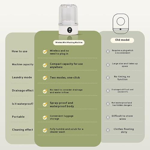 Experience the ultimate convenience in laundry care with our Mini Portable Rechargeable Washing Machine. Designed with a unique impeller and a thoughtful imitation hand-washing program, this compact washer is perfect for everyday use, whether you're at home, traveling, or in a dormitory. With two wash modes—5 minutes for a quick refresh and 10 minutes for a deeper clean—this washing machine adapts to your needs, ensuring your delicate garments like underwear and baby clothes are treated gently yet effectively. Its 3000mAh battery offers remarkable longevity, allowing for multiple washes without frequent recharging. Crafted from durable ABS and PP materials, this lightweight washer is both portable and waterproof, making it a reliable companion for your laundry tasks. The LCD digital display provides easy operation, while the 1L capacity is ideal for small loads, ensuring that you can maintain a fresh wardrobe effortlessly. Say goodbye to the hassle of traditional laundry methods and embrace the health-conscious choice of washing with our Mini Portable Rechargeable Washing Machine. It's not just a product; it's a solution for modern living that promotes cleanliness and convenience. Perfect for students, travelers, and anyone who values efficiency in their daily routine. Enjoy the peace of mind that comes with a healthier washing experience, all while saving time and space. Elevate your laundry game today!