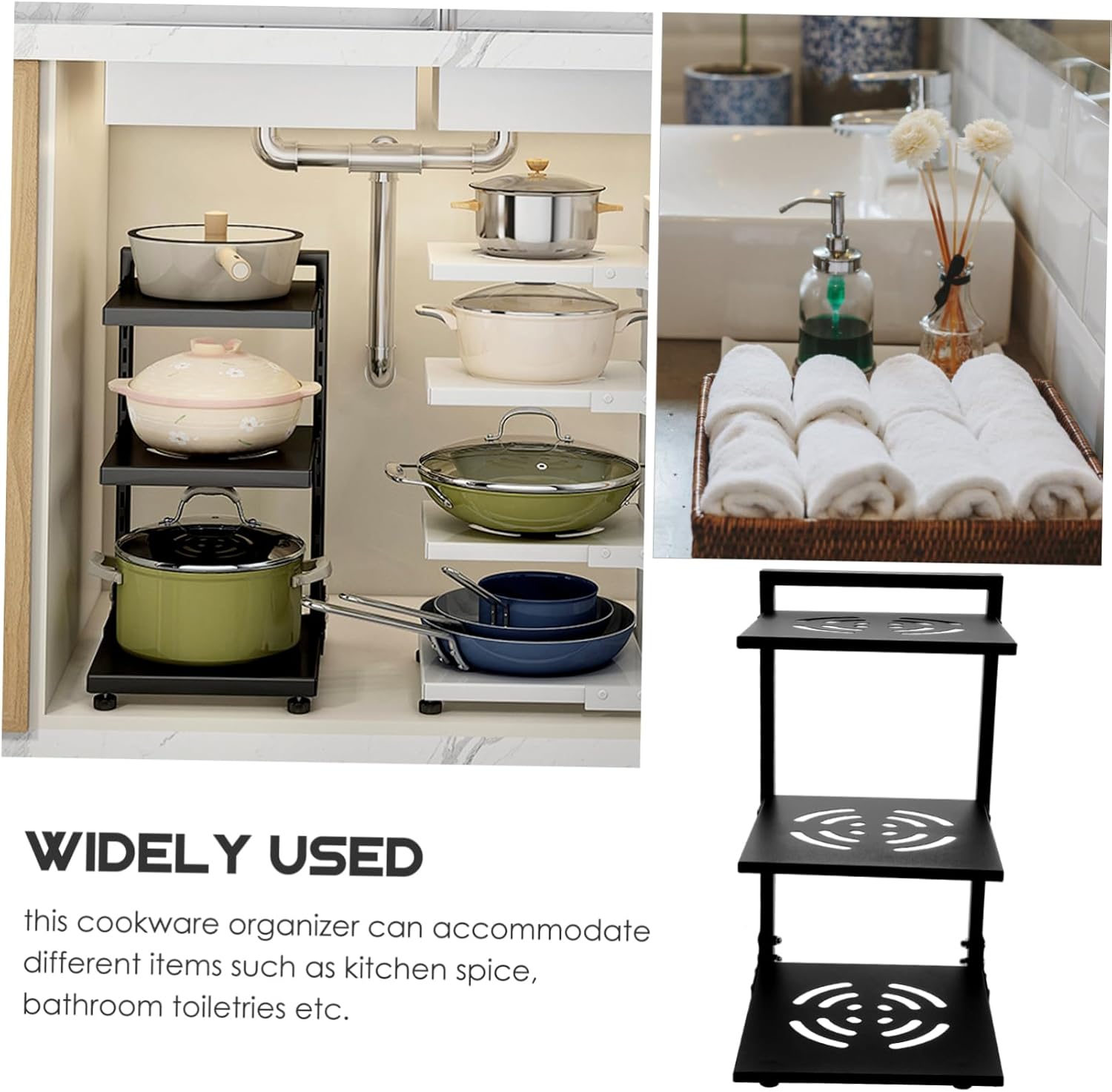 Package Include 1 x under sink organizer Characteristics -Color:black kitchen rack -Size:26.50X22.50X40.00cm/10.41X8.84X15.72in under sink organizers -Material:Carbon steel under sink shelf organizer - Excellent bearing capacity, and the space of each tiers can be adjusted due to the snap design, rather convenient kitchen sink organizer. - This pot and pan organizer can be easily assembled in several minutes, largely save your time and efforts sink storage organizer. - Adopting premium and sturdy materials, not easy to deform or break, this pots and pans organizer withstand shelf organizer. - Practical 3-tier pots and pans rack keep all your pans, pots, griddles, skillets neatly organized in cabinet, countertop, under sink or small corners kitchen sink organizer under cabinet. - Three layers storage, utilize spare space better, this pan organizer rack for cabinet is perfect for bathroom and kitchen storage under sink.Goods Informationunder sink organizers This under sink organizer is made from , can withstand lasting use.pot holder This under sink organizer will make home storage easier, suitable for storing many items like pot, pan, and other cookware.kitchen has high durability, not easy to deform or break due to the excellent bearing capacity