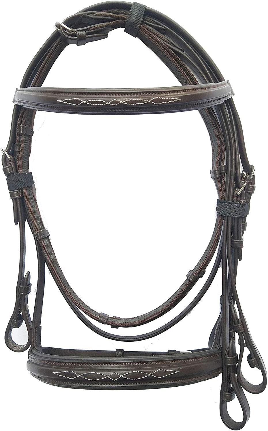The flat padded bridle made from premium quality leather with stainless steel fastenings & reins. The set is made from 100% premium leather.Riding with a bitless bridle is a great tool to use for horses who have difficulty accepting the bit. With pressure on the poll, chin and nose, the bitless bridle controls the horse through pressure points, allowing you to steer easily. Halter-style fit, silver-colored buckles with soft leather. Wipe clean with damp cloth after each ride. Apply leather cleaner and conditioner as necessary.This flat padded side pulls the bridle and makes the perfect choice training aid. Bridle features a comfortable padded browband, noseband, and crown.A squeeze on one rein pushes inoffensively but persuasively on the opposite half of the head. Where the head goes, the horse follows. Horses respond better to being pushed than pulled. They also prefer to receive the aids distributed painlessly over a large area of the head than painfully and focally in the mouth, an exquisitely sensitive region.Smoothly finished and curved with special polish & lacquered on premium quality of brass buckles for long lasting results.The leather finish is perfect for schooling or horse shows whether you are on the flat, or in the jumping ring and is great for daily use. One size fits most horses. SATISFACTION GUARANTEED: We at Saddlesworld solely believe in providing 100% customer satisfaction, and if in any case, you are unhappy with your purchase then please let us know, we will do anything required to make you a happy customer. So, buy our Saddles World Flat Padded Leather Bridle with confidence.