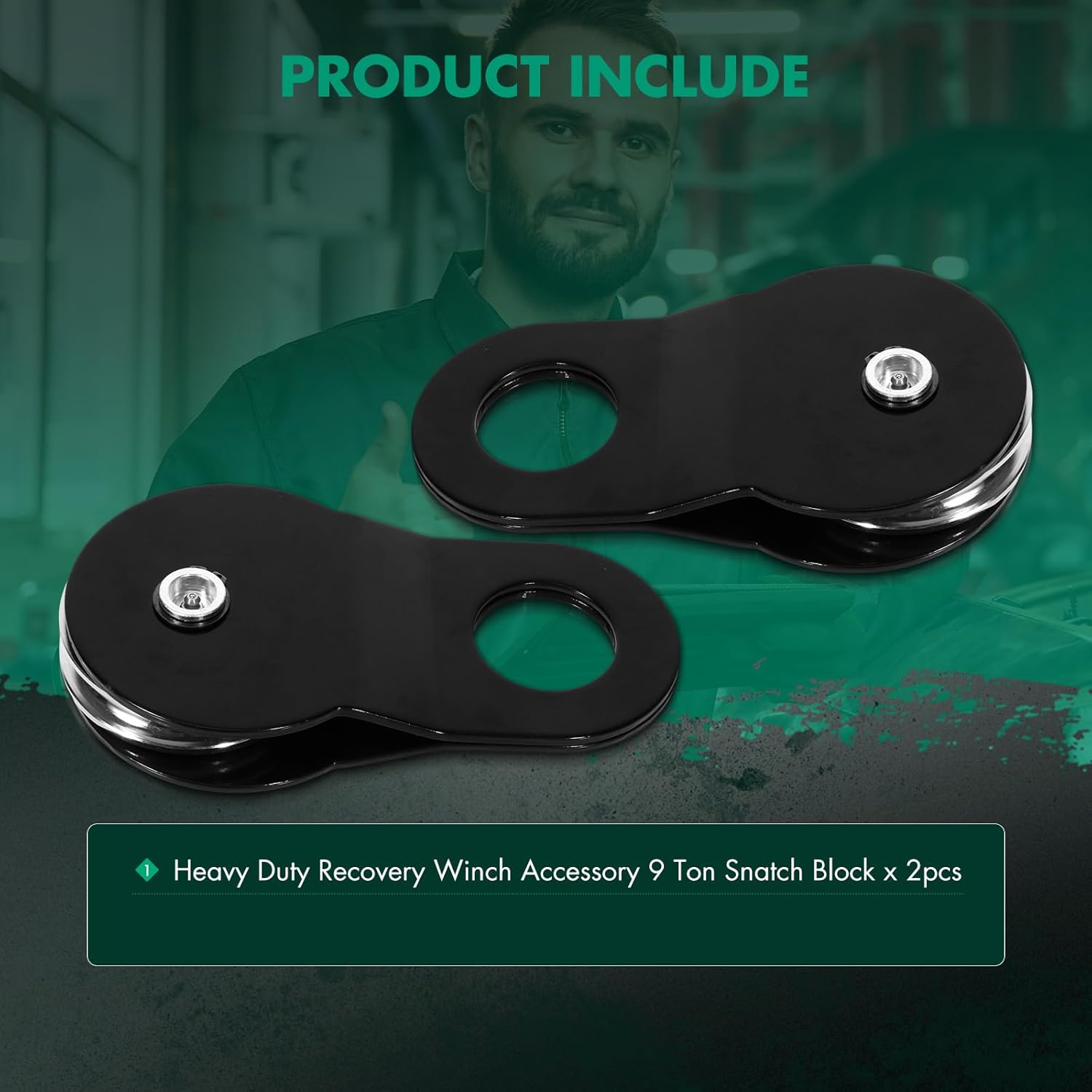 Features: √Black powder coating, weather. √Doubling the winch pull capacity. Designed for circumstances when direct winch line pull is not available. √Constructed from High Strength Steel (HSS),impact and not not easily deformation. √Pivoting function for fast attachment (no disassemble required) Model: SCITOO Winch Snatch Block · Accepts 1/2" to 3/4" winch cable or rope · Color: Black · Material: High Strength Steel · Capacity: 2, 000 LBS · Length: 10-5/16" · Width: 5-1/8" Package Including: 2 pcs Snatch Block (20,000 lb)