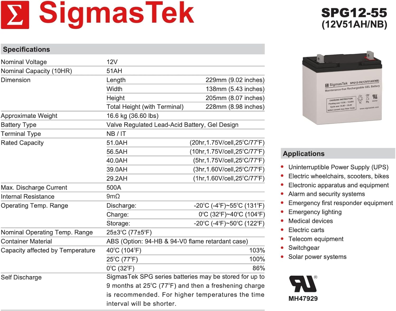 The genuine SigmasTek SPG12-55 (NB) battery is a high-quality 12V 55Ah NB battery. We supply only factory-fresh, high-quality batteries. We guarantee the best price and 100% compatibility with your current 12V 51Ah NB battery. This SLA battery delivers dependable performance and durability - backed by a 1-year warranty for peace of mind. Popular applications for our SLA batteries are UPS, emergency lighting, security, fire and burglar alarms, scooters, wheelchairs, medical, and other.
