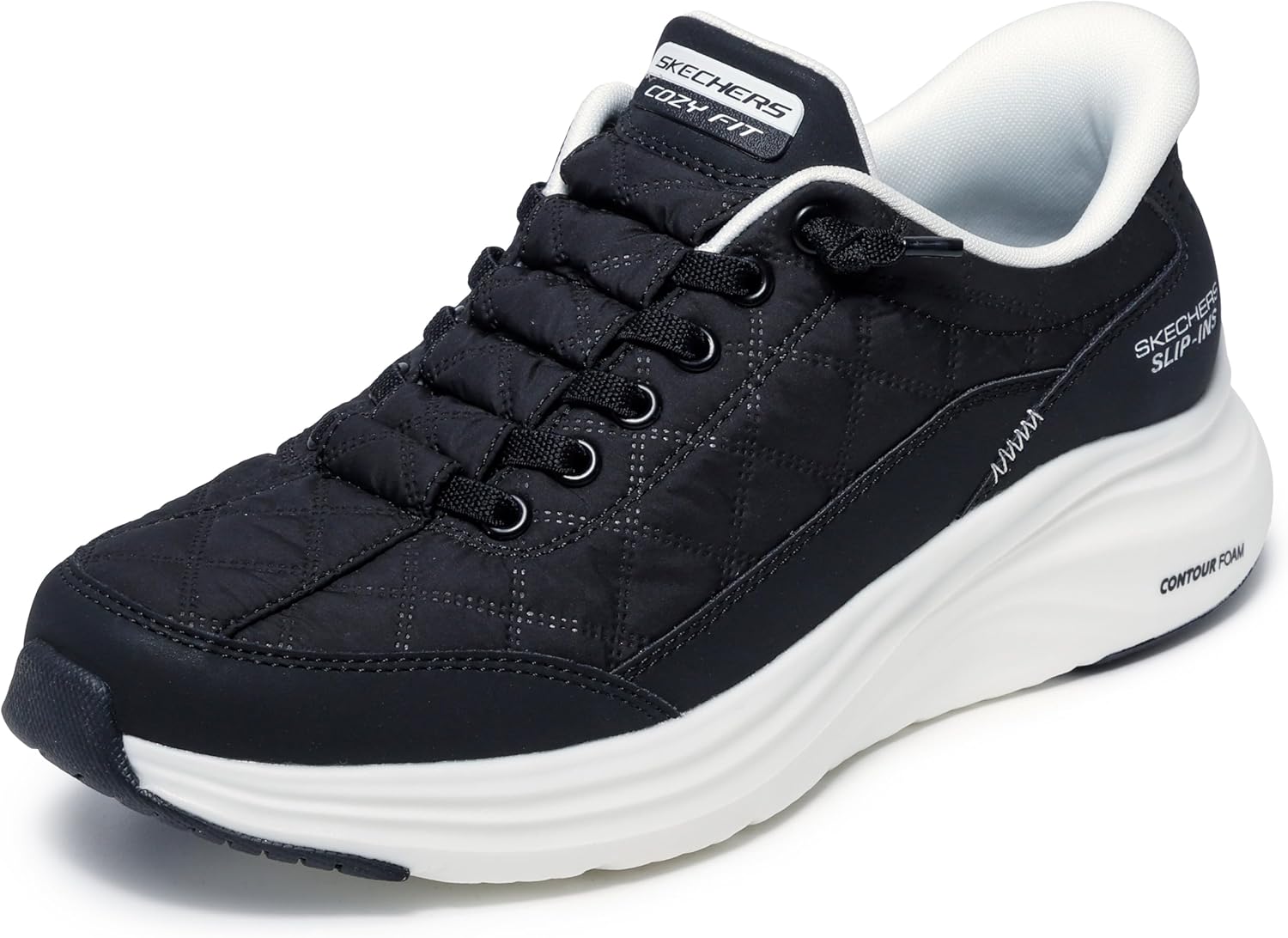 Soft comfort meets easy-going style with the Skechers Slip-ins: Contour Foam - Cozy Fit sneakers. A quilted upper with tied-off stretch laces wraps the foot in plush support, while the Heel Pillow design helps keep everything secure without the need to bend down. Contour Foam cushioning and an Air-Cooled Memory Foam insole work together to deliver lightweight, responsive comfort all day long.Machine washable air-quilted fabric and synthetic upper with No Tie Fit stretch lacesEasy to wear Hands Free Slip-ins styling for an easy fit Exclusive Heel Pillow holds your foot securely in placeSoft Cozy Fit premium soft quilted materials wrap your feet in luxurious comfortAir-Cooled Memory Foam cushioned comfort insoleContour Foam super lightweight midsole Super flexible traction outsole
