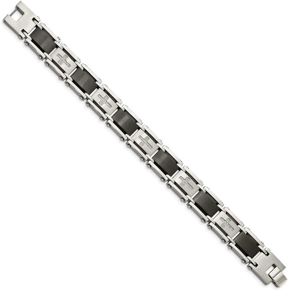 Features:Finish:Polished & BrushedStone Type_1:DiamondLength of Item:8.75 inPlating:IP-PlatedStone Weight_1:0.250 ctw (total weight)Chain Length:8.75 inChain Type:Link, OtherChain Width:19 mmClasp /Connector:Fold Over CatchMaterial:Stainless SteelWidth of Item:19 mmPackaging:Gift BoxedJewelry Type:BraceletsSold By Unit:EachBracelet Type:DiamondsMaterial Color:WhiteItems per Pack:1Plating Color:BlackStone Creation Method_1:NaturalAll weights and measurements are approximate and may vary slightly from the listed information.