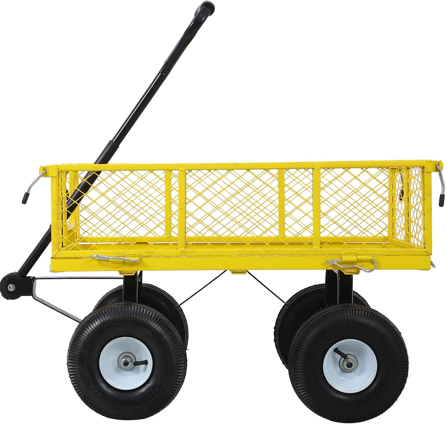 Product Features EFFORTLESS YARD WORK: Say goodbye to back-breaking labor and hello to convenience with our versatile utility cart. Designed with the perfect size of 34" W x 18" D x 22" H , The pneumatic tires are10" in diameter.this cart provides ample space for all your yard work needs. With a weight capacity of up to 550 lbs, you can transport heavy loads with ease. VERSATILE HELPER: Whether you're cleaning up debris, hauling brush, or moving landscape materials, our gardening cart has got you covered. Its removable sides allow for quick and easy conversion into a flatbed, making loading and unloading a breeze. Maximize its functionality and tackle every task in your yard or farm effortlessly. BUILT TO LAST: Our utility cart is built with durability in mind. Crafted from sturdy steel mesh and finished with a vibrant, powder-coated coating, it can withstand the toughest weather conditions. This not only ensures its longevity but also makes it resistant to rust and corrosion, guaranteeing years of reliable service. SMART DESIGN FOR EASY USE: Working smarter, not harder is our motto. The large, padded handle provides a comfortable grip and allows for easy maneuverability. With a 180-degree turn range, you can navigate tight spaces effortlessly. The reinforced axles and pneumatic tires with a diameter of 9.5" roll smoothly over any terrain, making your yard work a breeze.