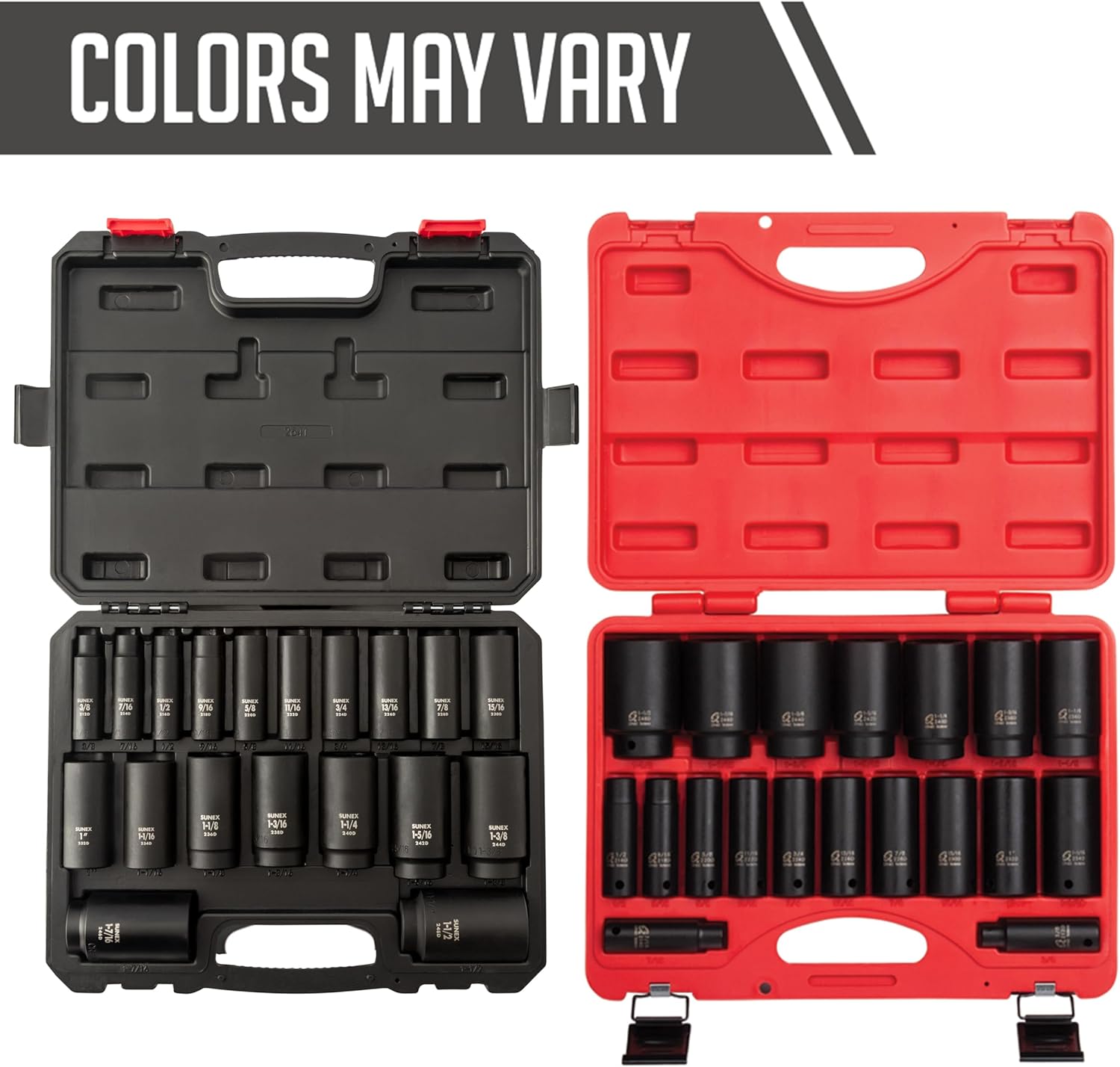 Product Description The SUNEX Tools 2641 is a 19-piece 1/2 in. drive sae impact socket set with deep coverage. Chrome Molybdenum Steel supports impact-duty fastening work. From the Manufacturer This Sunex 1/2 inch drive deep 19 piece SAE impact socket set includes the most common sizes used for automotive repair. It includes 19 SAE sockets. It is made of CR-MO alloy steel for long life. It is fully guaranteed and includes a heavy duty blow molded storage case. Set includes in SAE inches: 3/8, 7/16, 1/2, 9/16, 5/8, 11/16, 3/4, 13/16, 7/8, 15/16, 1, 1-1/16, 1-1/8, 1-3/16, 1-1/4, 1-5/16, 1-3/8, 1-7/16, 1-1/2.