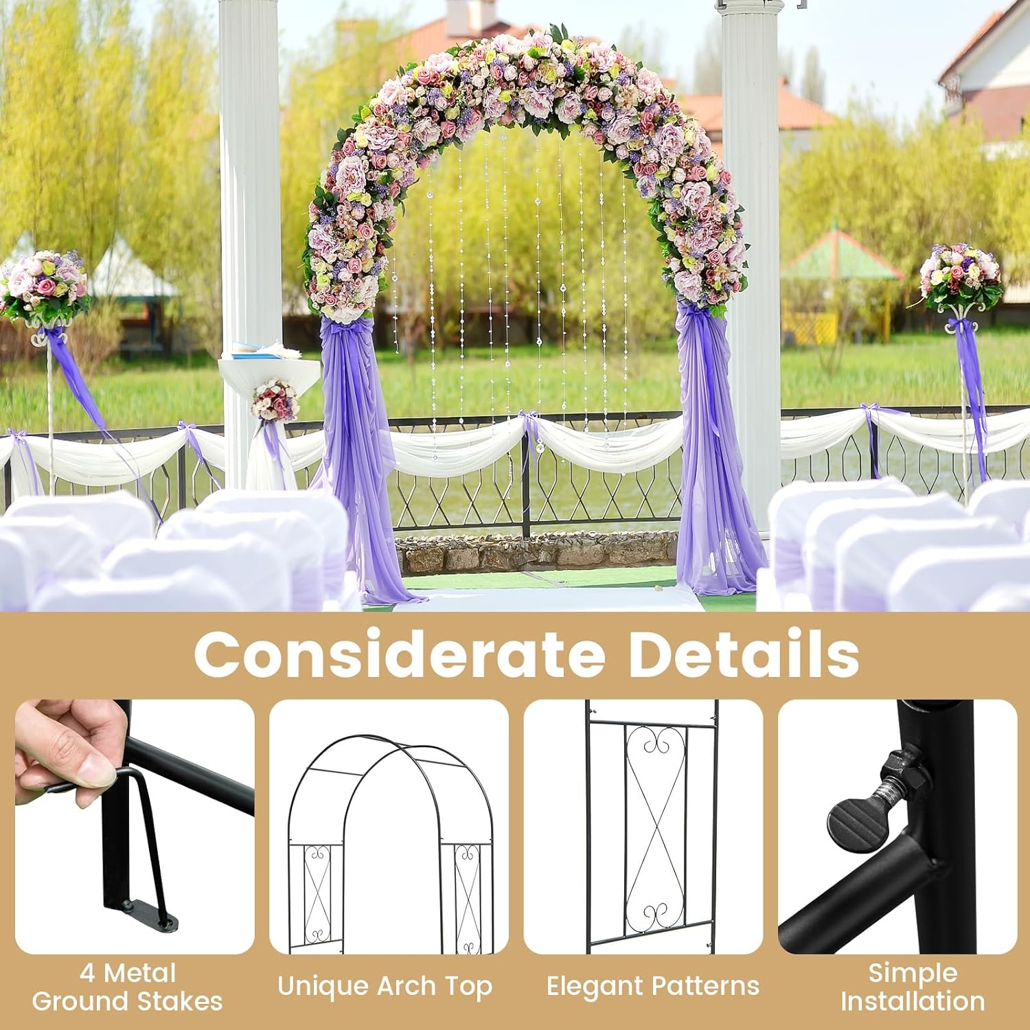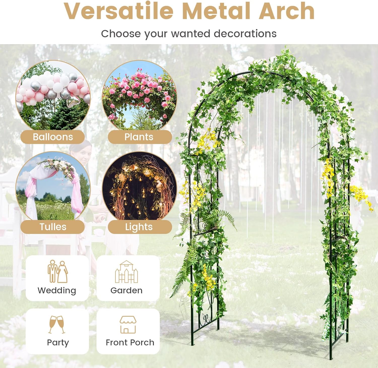 DescriptionThe 7.2 ft garden arbor will highly enhance the beauty of your garden or front porch.Made of top-notch metal, this garden arbor is designed to brave the outdoors and endure through the passage of time. With robust build and secure ground stakes, it will always stand with high stability. Additionally, this arch trellis offers versatility with various embellishments like balloons, lights, and plants, allowing you to customize it to your liking. Whether you have a wedding to plan, a party to throw, or simply wish to amplify the allure of your yard, this outdoor arbor will surely impress.FeatureReinforced metal frame resists to deformation and bendingPowder-coated surface for rust resistance4 ground stakes secure the arbor to the groundPerfect for party, wedding, garden and so onChoose your wanted decorations such as balloons, lights, plants, etc.Elegant arch design makes the arbor always an eye-catcherEasy to assemble with the detailed instructionSpecificationColor: BlackMaterial: MetalOverall Dimensions: 47.5” x 21” x 87” (L x W x H)Trellis Height: 61”Net Weight: 15 lbsPackage Includes:1 x Garden Arbor4 x Ground Stake1 x User’s Manual