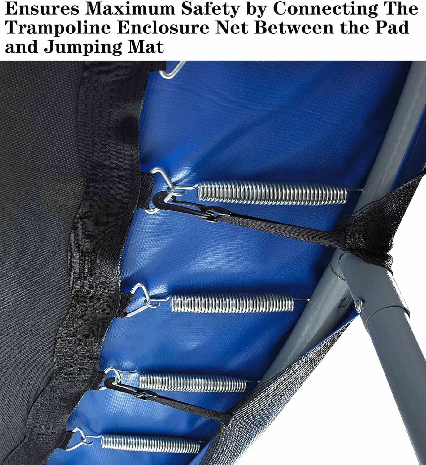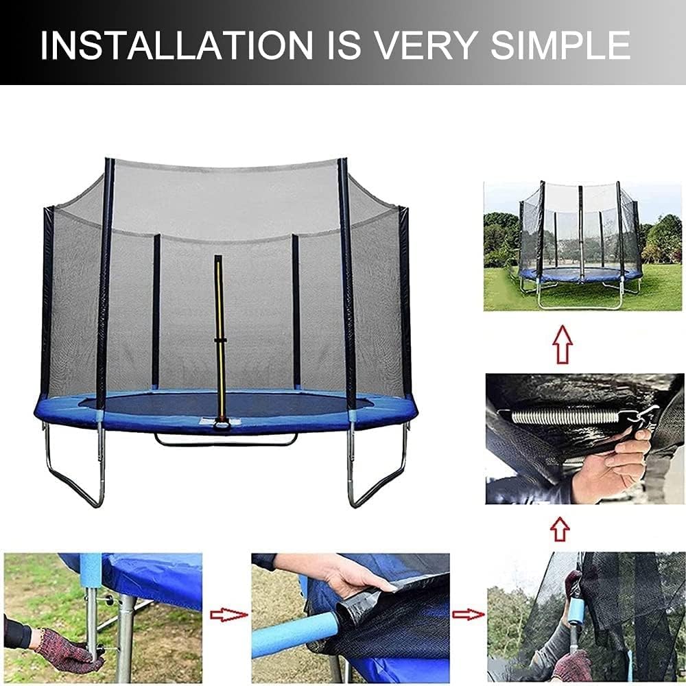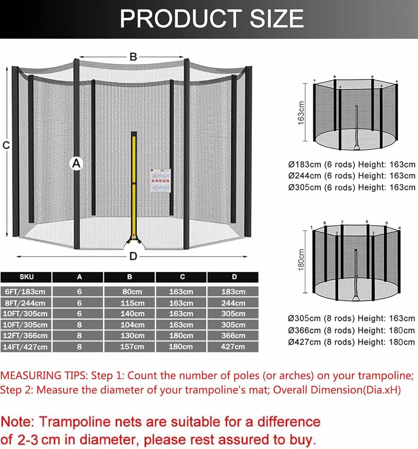 The net is suitable for trampoline with round fame, providing kids safe jumping place for entertainment. This safety enclosure net is made of durable PE material, which is weather-resistant and tear-resistant, ensuring lasting service life. A zipper door with double-head lock facilitates entrance and additional safety buckles provides extra protection for kids when they are jumping. Moreover, the enclosure net with high height can be firmly attached to the jumping mat. It is easy to assemble the net on the trampoline without spending much time and energy.Specifications:Color: BlackMaterial: PEPackage includes:1 x Enclosure Net6 x trampoline net capsMeasuring Tips1. First, identify your trampoline enclosure type2. Then measure your frame diameter is 14ft3. Finally count the number of pole is 8 straight poles or 4 archesNOTEPlease confirm the size and number of poles of your trampoline before purchasing the trampoline safety enclosure net.