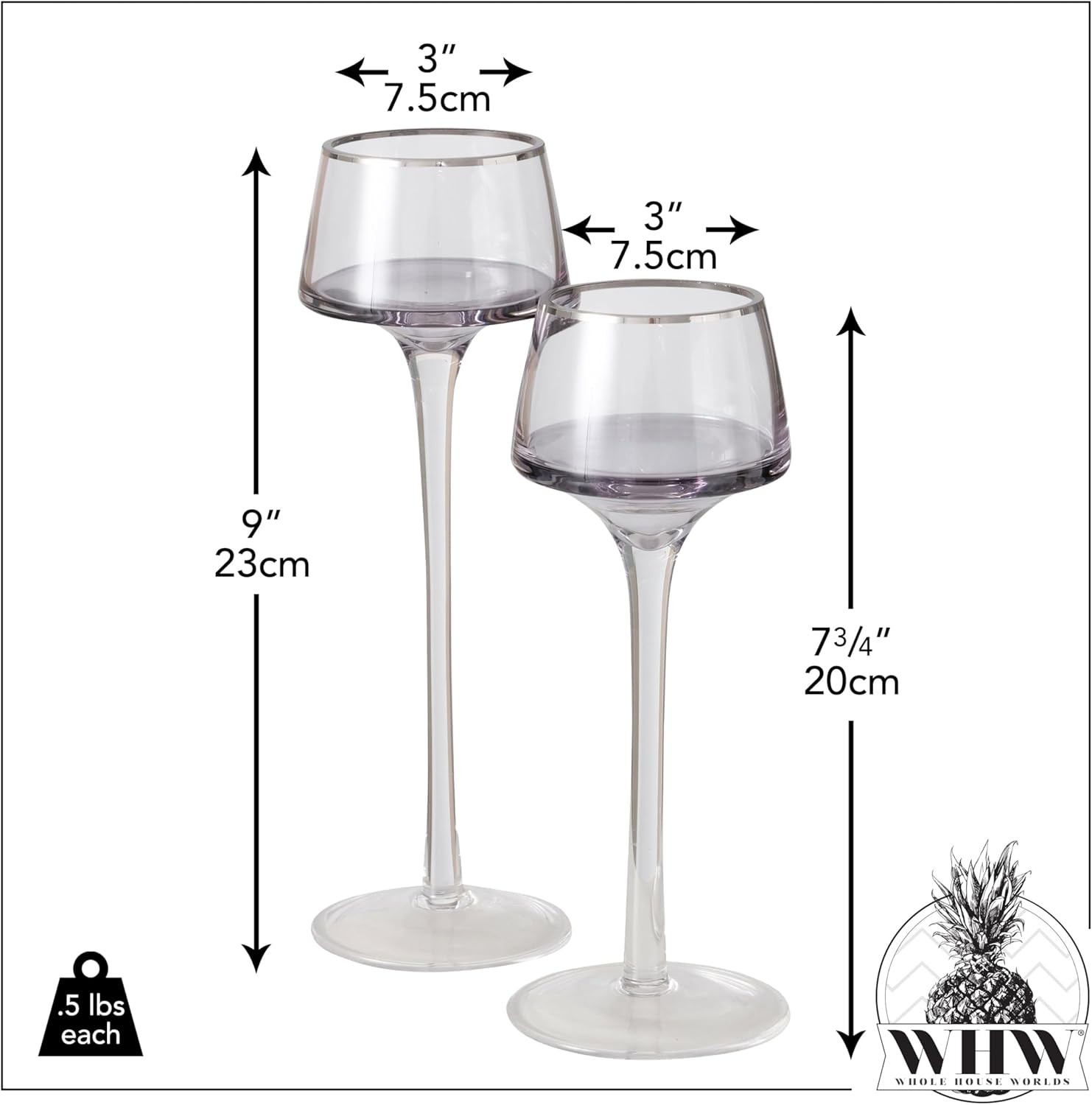 Add a touch of elegance to your table with these baby long stem candle cups. Like little glasses of wine, this set of baby long stem candle cups evoke party panache and bring a lively spark of romance to any table top. Crafted of clear glass with silver rims. Simply add small votives or tea light candles for truly breathtaking illumination. Well sized, the each candle holder in this set measure as follows: 3 D x 7.75 H inches, .5 lbs. (7.5 D x 20 H cm, 175 grams) and 3 D x 9 H inches, .5 lbs. (7.5 D x 23 H cm, 175 grams) Create a dramatic display of candle light with the set for unforgettable moments. Personalize your look by adding seasonal ornaments, flowers, shells, ribbons or beach sand to the base. Always, a welcome and thoughtful gift.